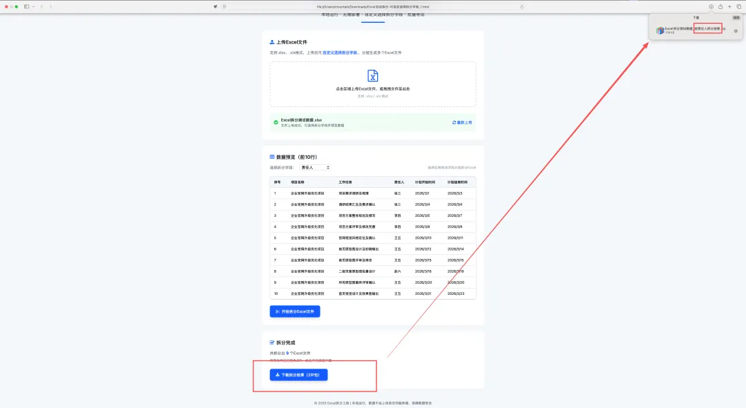 划重点!这款工具全程在浏览器里操作,无需联网,数据不上传任何服务器。所有解析、拆分、打包步骤都在本地完成,再也不用担心客户信息、薪酬、财务数据等敏感内容外泄,安全感拉满!