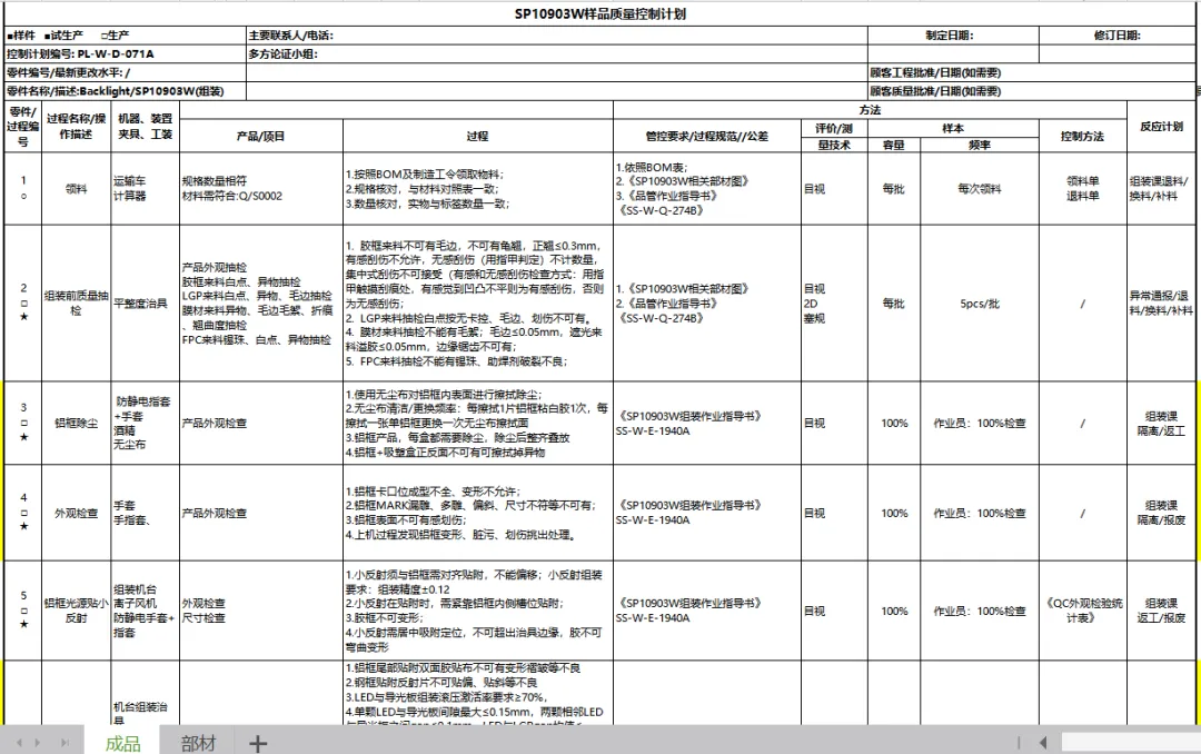 | | | | 1.铝框尾部贴附双面胶贴布不可有变形褶皱等不良 2.钢框贴附反射片不可贴偏、贴斜等不良 3.LED与导光板组装滚压激活率要求≥70%, 4.单颗LED与导光板间隙最大≤0.15mm,两颗相邻LED与导光板之间gap≤0.1mm,LED与LGPgap均值≤0.1mm, 5.灯条与LGPGap100%CCD检验,5pcs/2H抽检 6.反射片胶拉拔力测试(制作专用设备),标准≥10N,2H/5pcs抽检 7.LGP反射固定胶组装精度要求±0.15,2pcs/2H抽检 8.反射片与LGP组装精度要求±0.15,2pcs/2H抽检 9.LGP胶激活率≥80% | 1.《SP10903W相关部材图》 2.《SP10903W组装作业指导书》 SS-W-E-1940A | | | 2D抽测首检5pcs,巡检5PCS/2H CCD检验100% | |