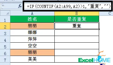 =IF(COUNTIF(A$2:A2,A2)>1,"重复","")