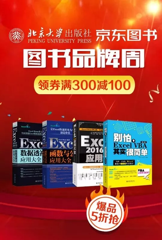 北京大学出版社京东图书品牌周活动,品牌图书领券满 300减 100 ,爆品 5折抢,【Excel三大神器】又一次迎来大优惠,大家记得点击下方图片进入小程序抢优惠券哦