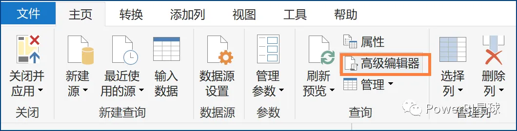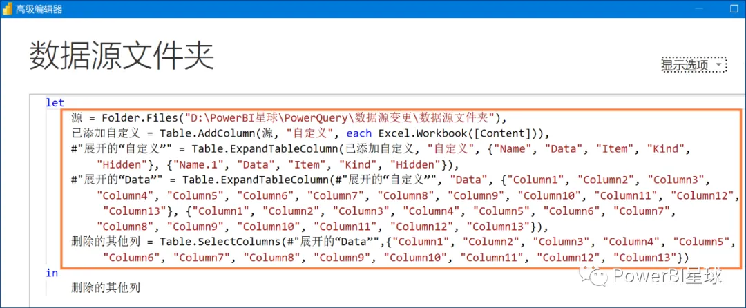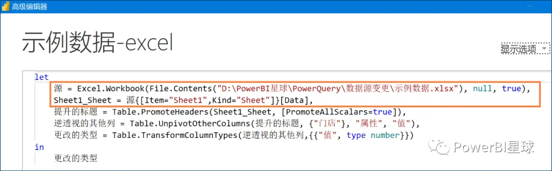 在高级编辑器中记录有这个数据从导入到处理的每个步骤的M代码,从Excel工作簿获取数据时,导入数据的步骤是前两行,如下图框住的部分。
