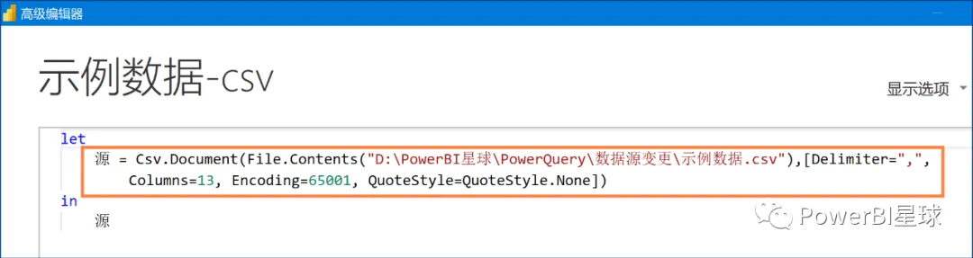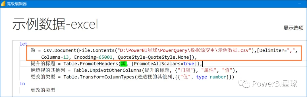 我们可以利用PQ来生成csv文件导入的公式,具体做法就是再导入一下csv文件,导入后可不用做任何整理,打开高级编辑器,复制源这个步骤的M公式,下图中框住的部分。