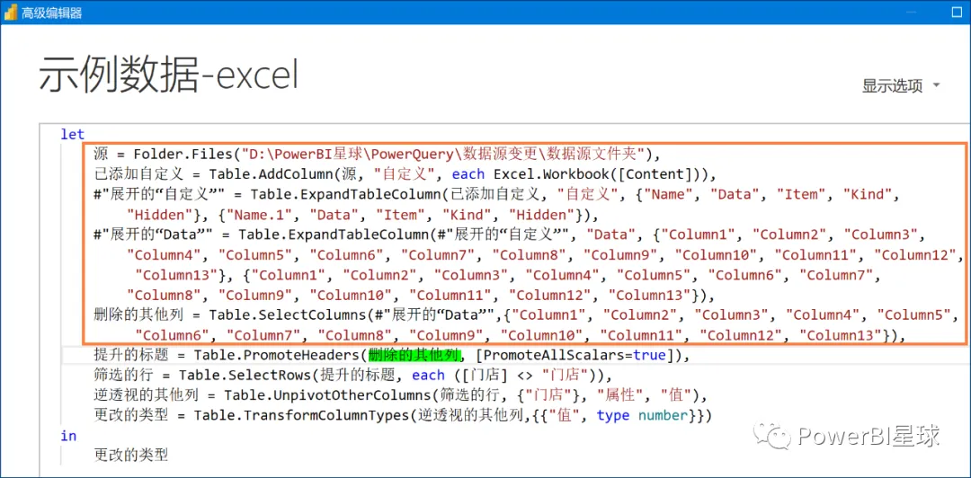 然后替换粘贴到原来的Excel数据源查询中(也要注意更改下一个步骤中所引用的上一个步骤的名称)。