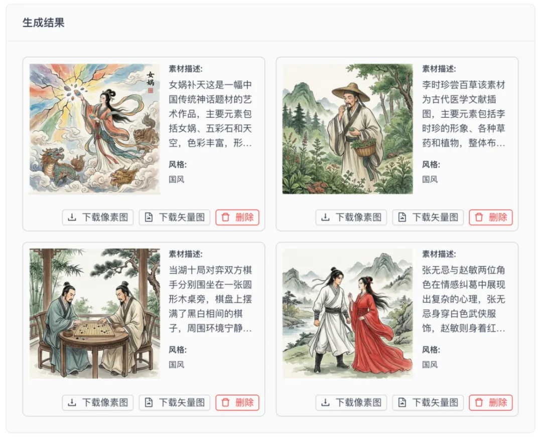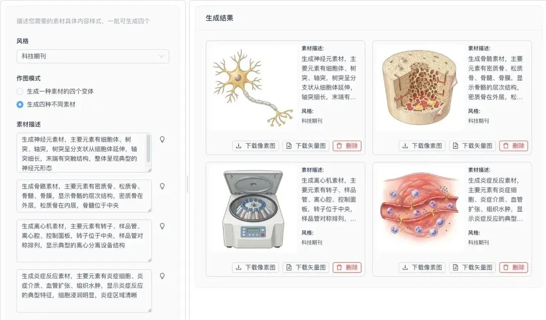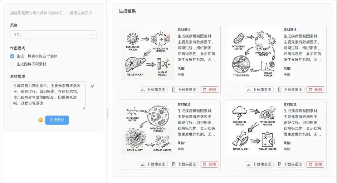 特色之一:一次性高效生成四种素材,像素或矢量图可供下载