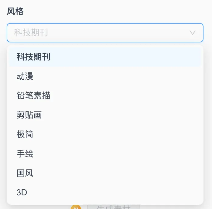 我们知道,不同场景下,素材可能需要不同的风格。没问题,通过提示词的优化,我们内置了一些常见的风格类型,不够用的话还可以跟我们提。