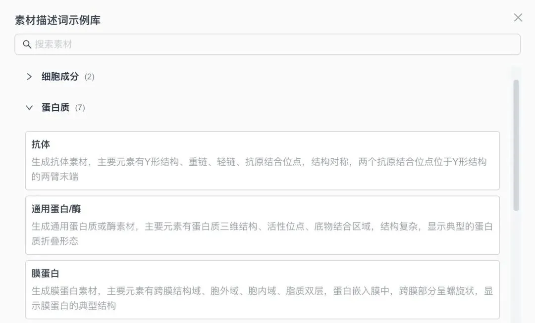 有些小伙伴可能会问,可是,我不会写专业的素材描述啊,那些专业的名词术语,我一个也想不起来。我只会说“大哥,俺也一样”。没关系,我们已经帮你生成了一批素材描述词的示例库。这个库,按二级分类结构,已经示范了大量直接可用的素材描述语段,应该已经覆盖了很大一部分偏生物医学的素材场景。