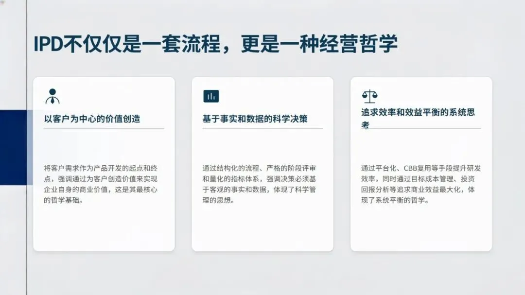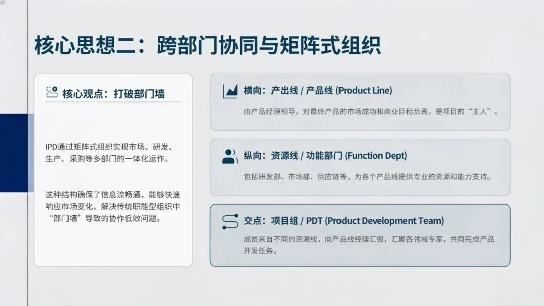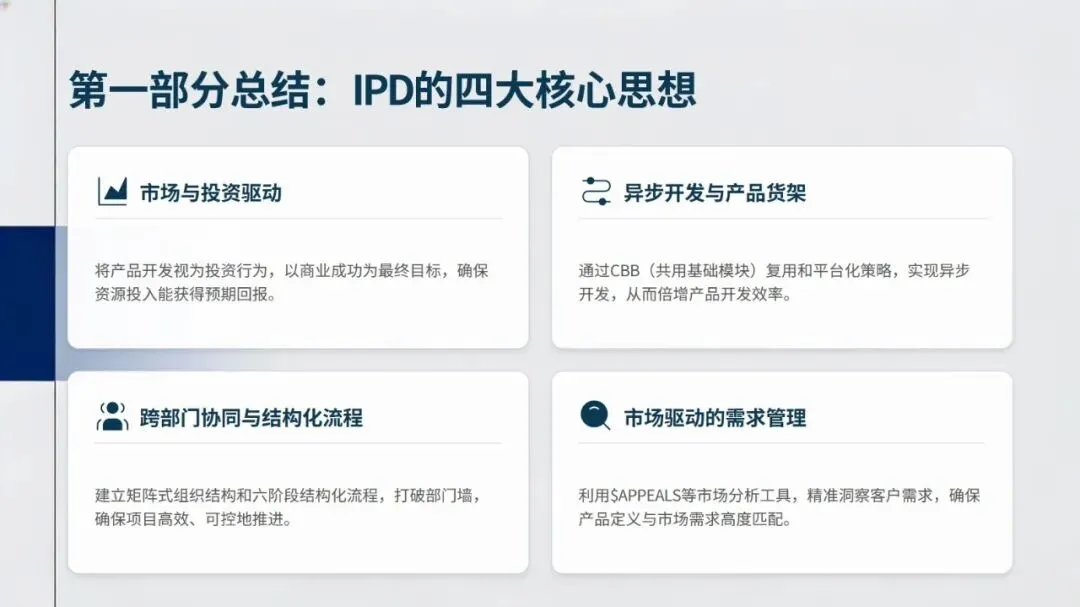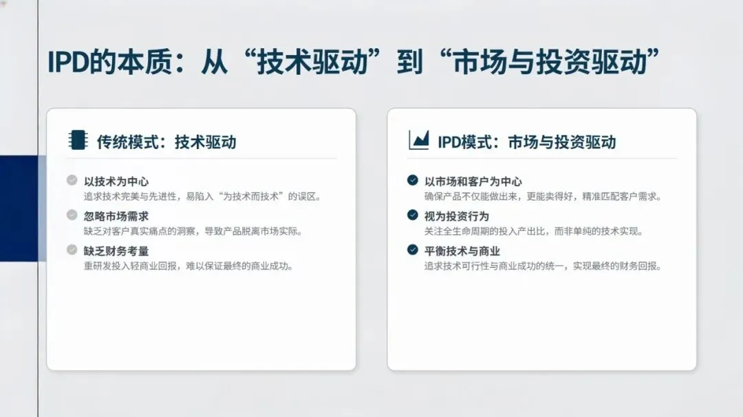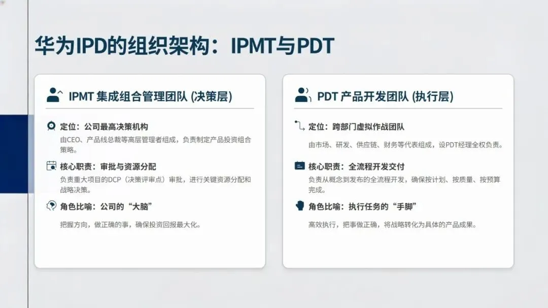 华为产品研发管理的核心竞争力源于集成产品开发(IPD)模式,这一体系并非单纯的流程规范,而是以市场与投资为导向的系统化经营哲学。IPD 通过技术开发、平台开发与产品开发的异步分离,构建七级产品货架与 CBB 共享模块体系,结合矩阵式组织架构与强矩阵资源配置,实现跨部门全流程协同。