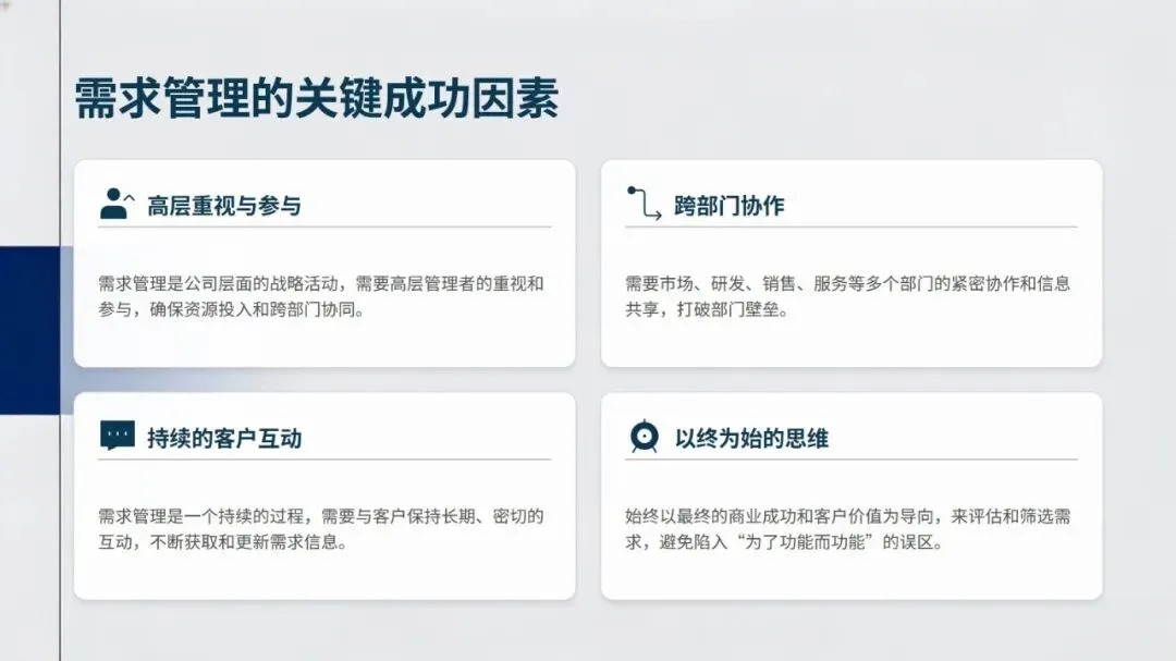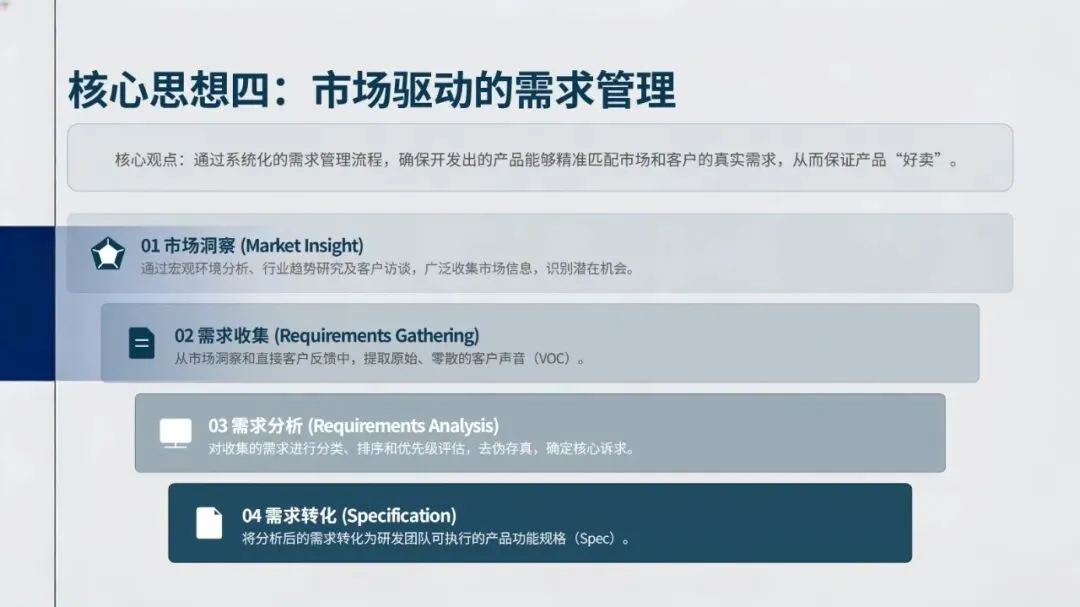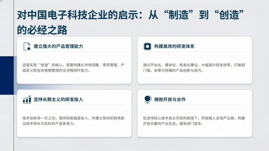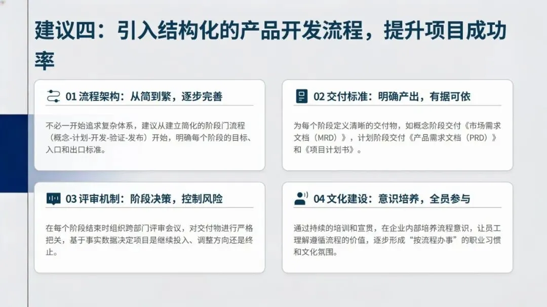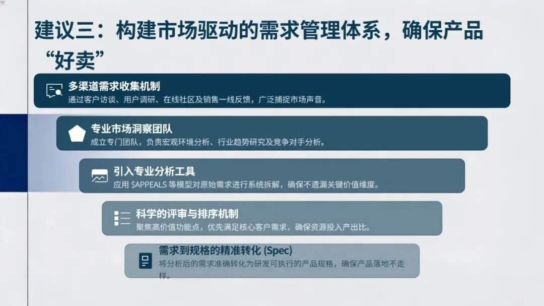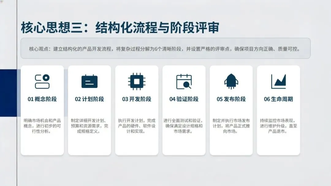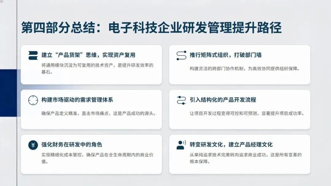 其核心启示在于:以产品货架思维实现技术复用,以市场驱动的需求管理($APPEALS 模型)锚定客户价值,以结构化流程与财务融合管控研发全周期。这套体系为电子科技企业提供了可借鉴的路径,证明通过流程优化、组织协同与资源整合,能够构建可持续的产品创新能力,支撑企业长期高质量发展。