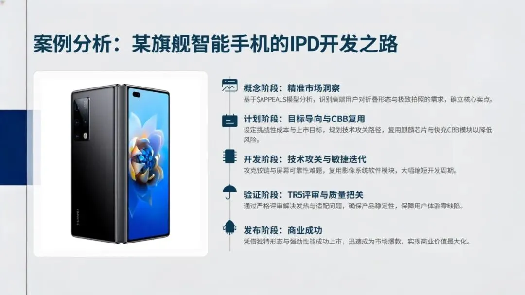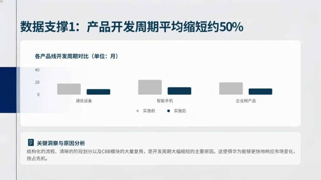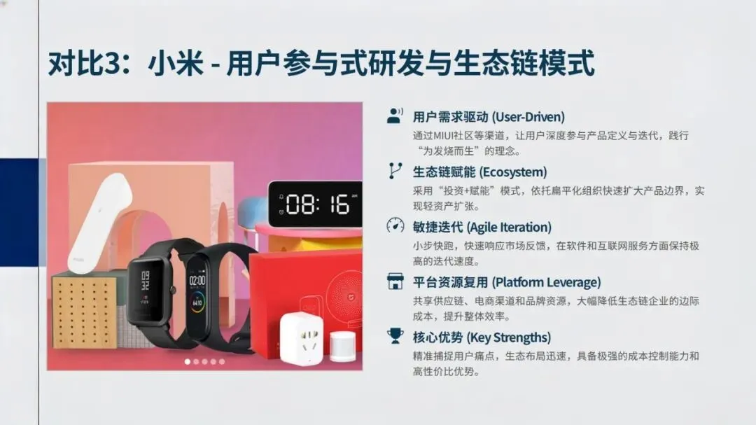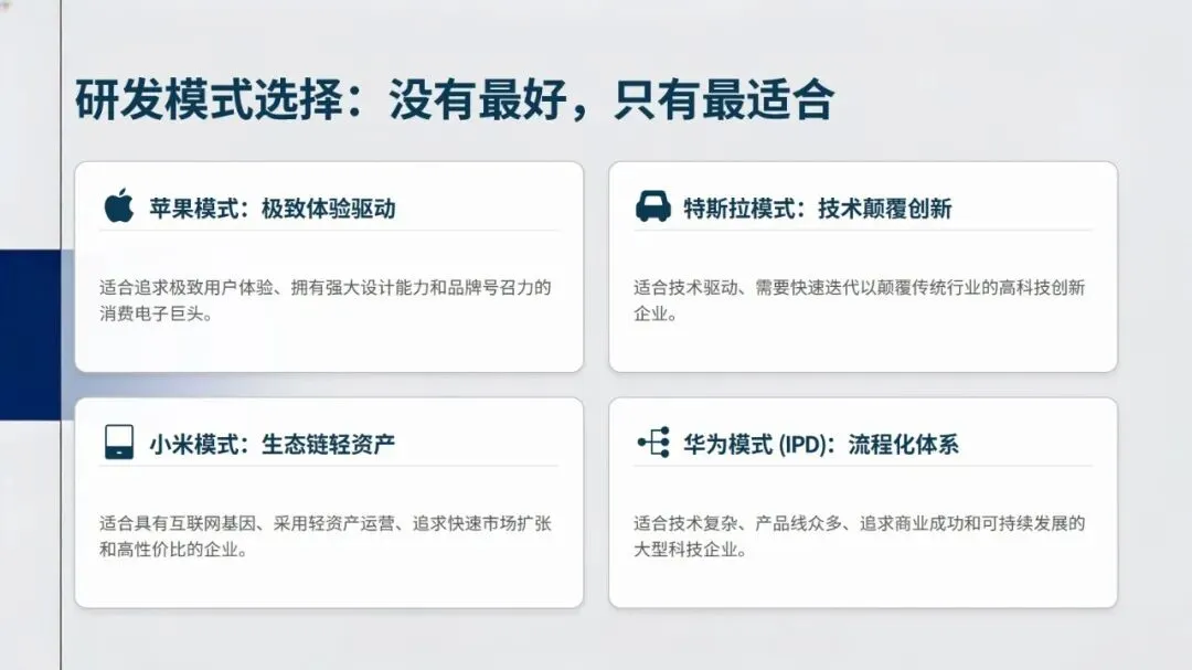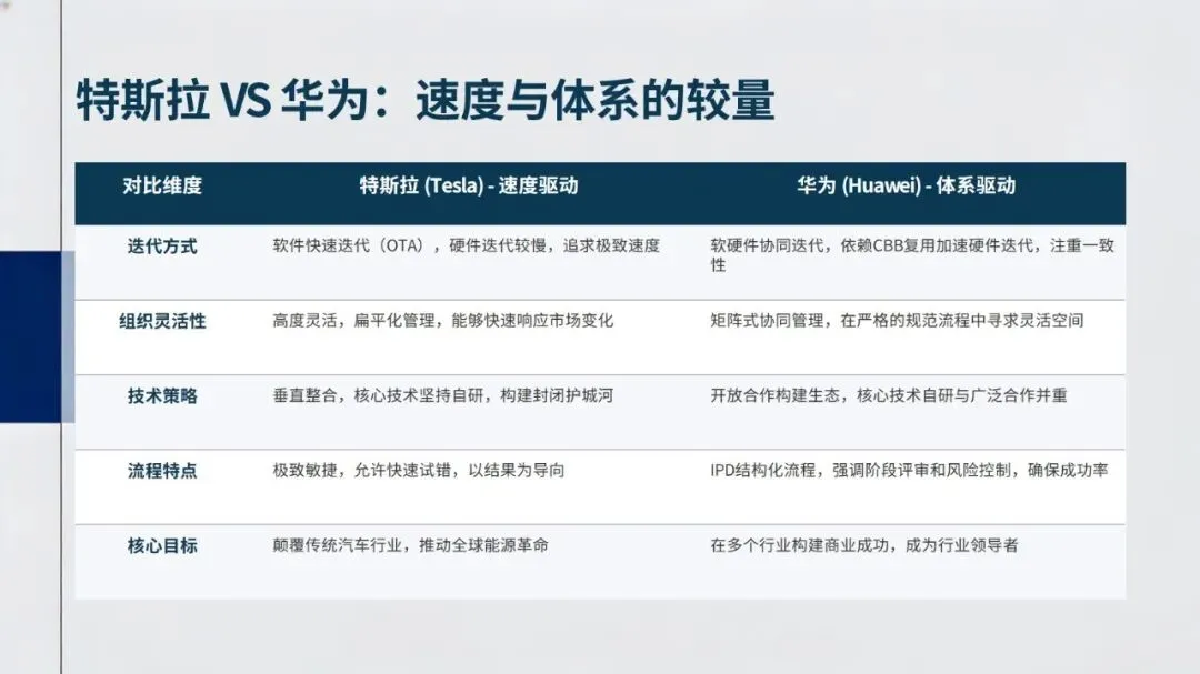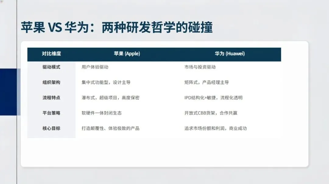 数据显示,该模式使华为产品开发周期缩短 50%,成功率提升至 70%,研发资源利用率超 85%,共享模块使用率达 60%-70%,显著降低成本并提升市场响应速度。与苹果的设计主导、特斯拉的敏捷迭代、小米的生态协同相比,华为 IPD 更强调结构化流程、阶段评审与投资回报,形成独特竞争优势。