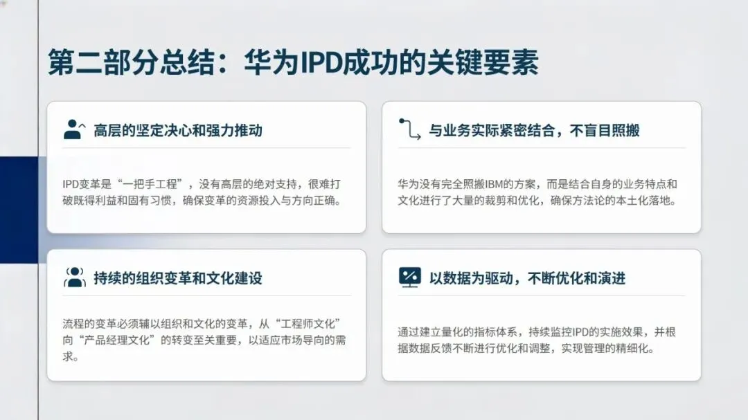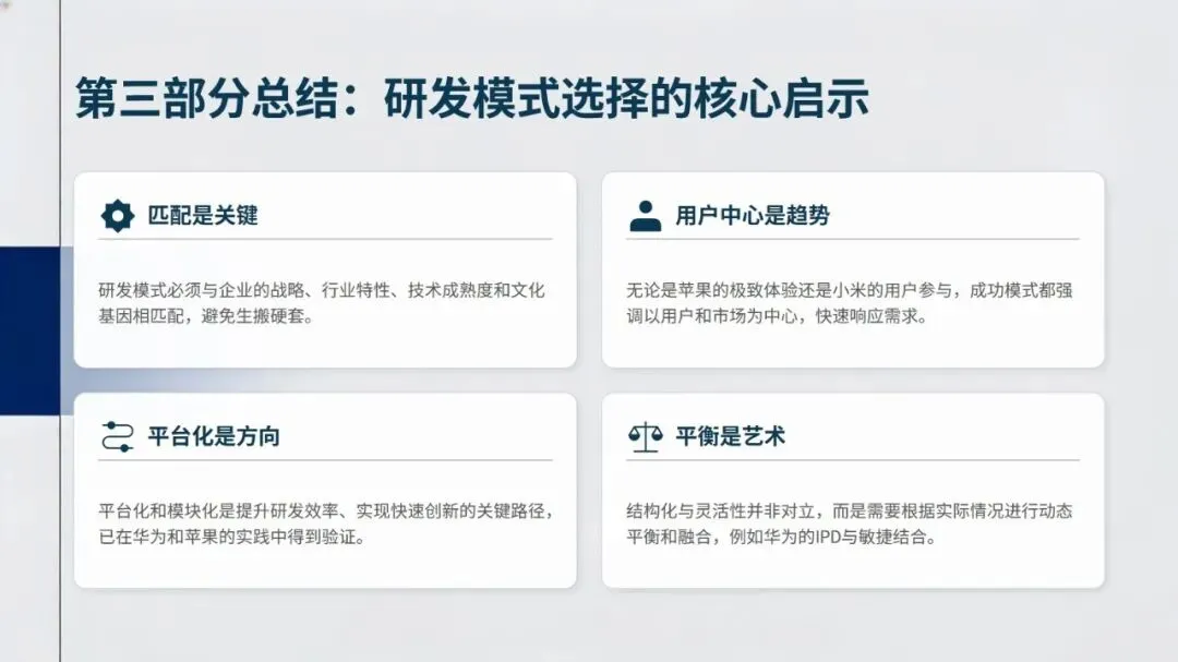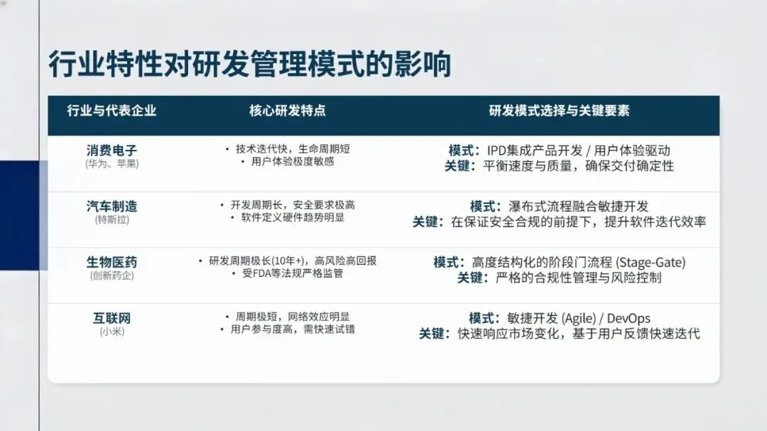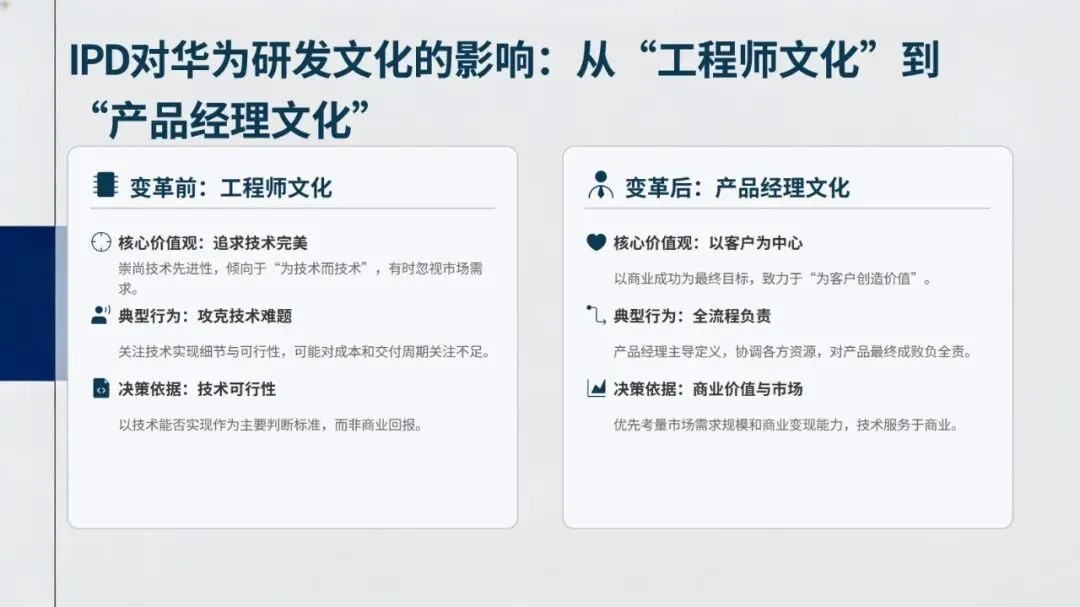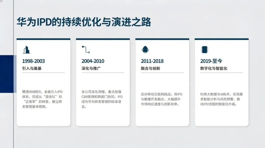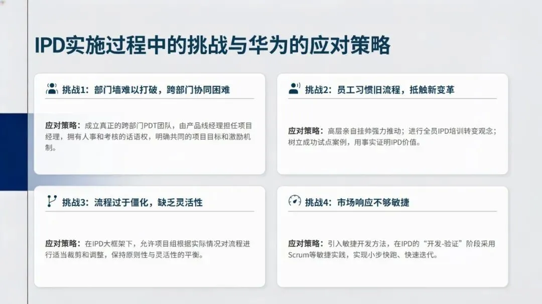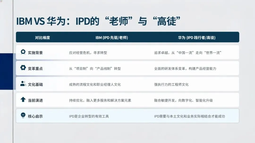 数据显示,该模式使华为产品开发周期缩短 50%,成功率提升至 70%,研发资源利用率超 85%,共享模块使用率达 60%-70%,显著降低成本并提升市场响应速度。与苹果的设计主导、特斯拉的敏捷迭代、小米的生态协同相比,华为 IPD 更强调结构化流程、阶段评审与投资回报,形成独特竞争优势。