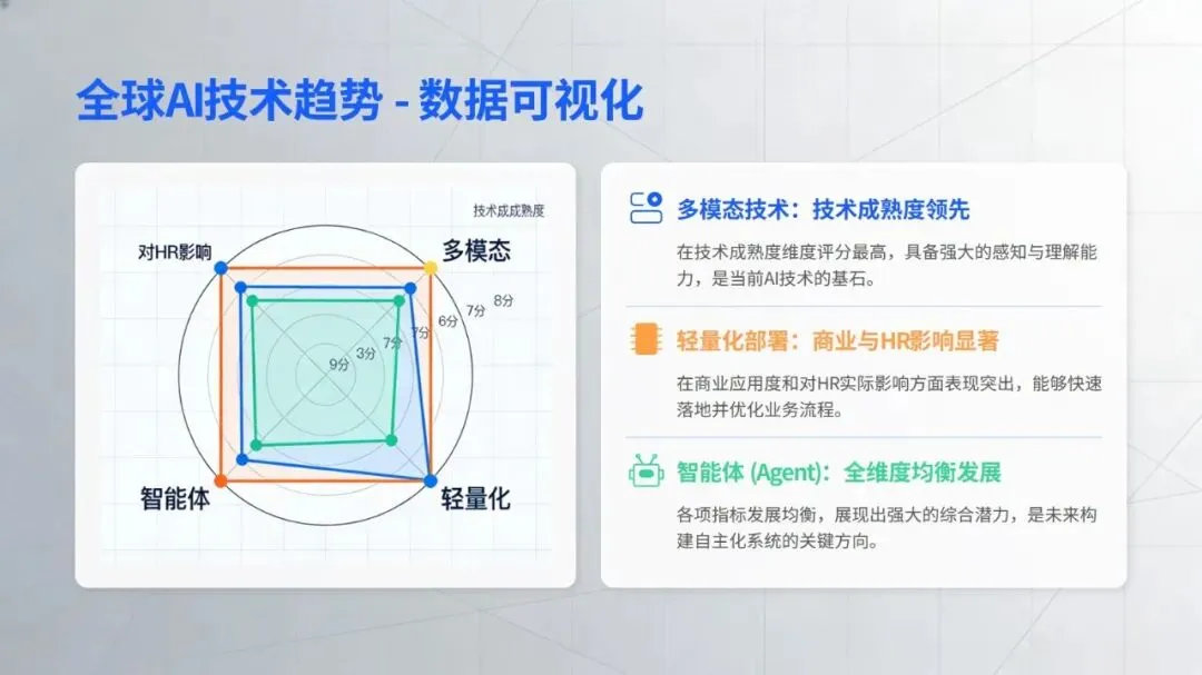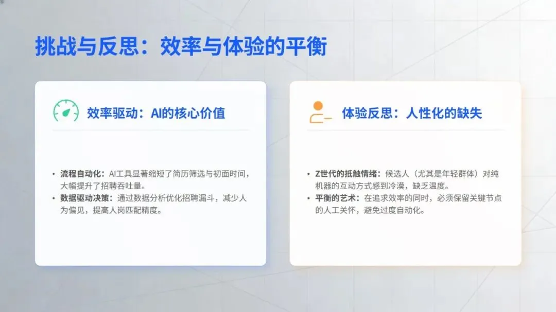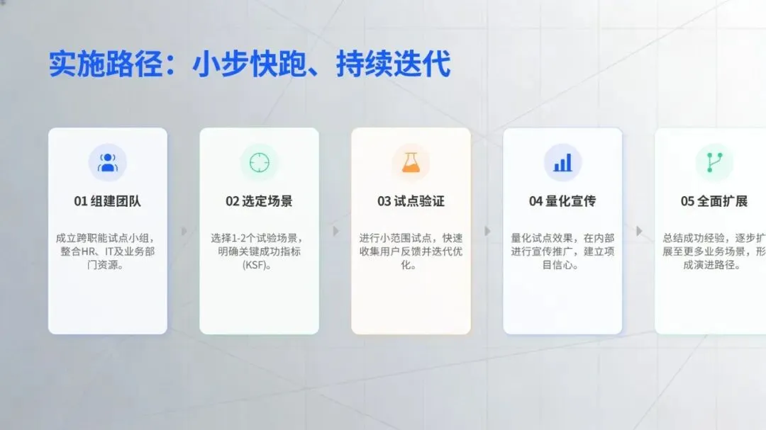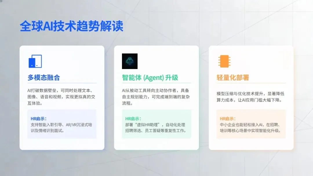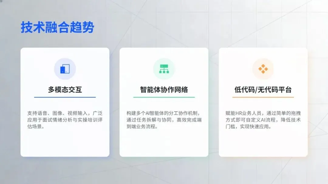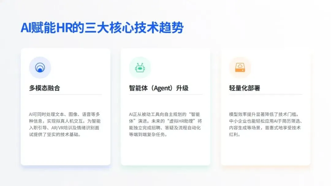 企业推进相关应用时,需兼顾效果与风险,优先选择简历筛选、政策问答等易落地、见效快的场景切入。未来,随着技术与业务的深度融合、组织数据治理与协作能力的提升,智能技术将从局部试点走向全面应用,推动 HR 工作从事务执行转向战略赋能,让人才管理真正回归赋能组织发展的核心价值。