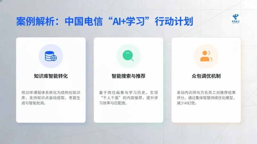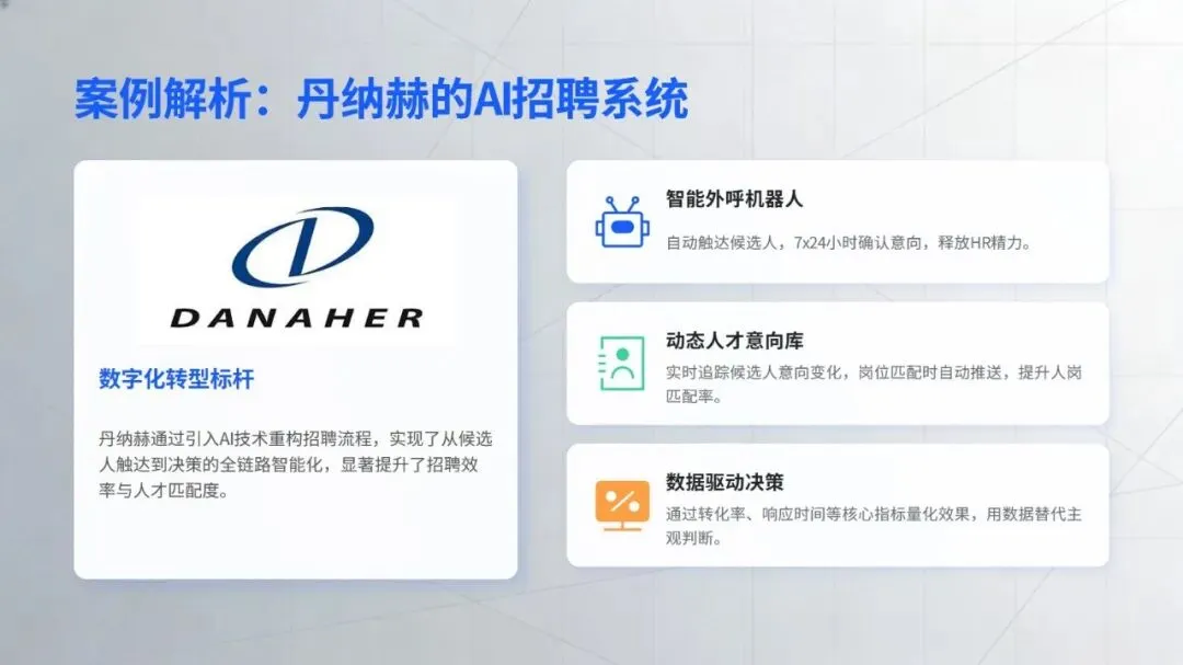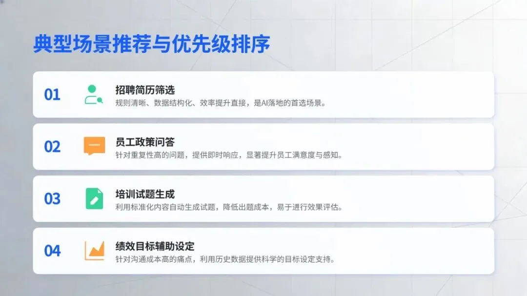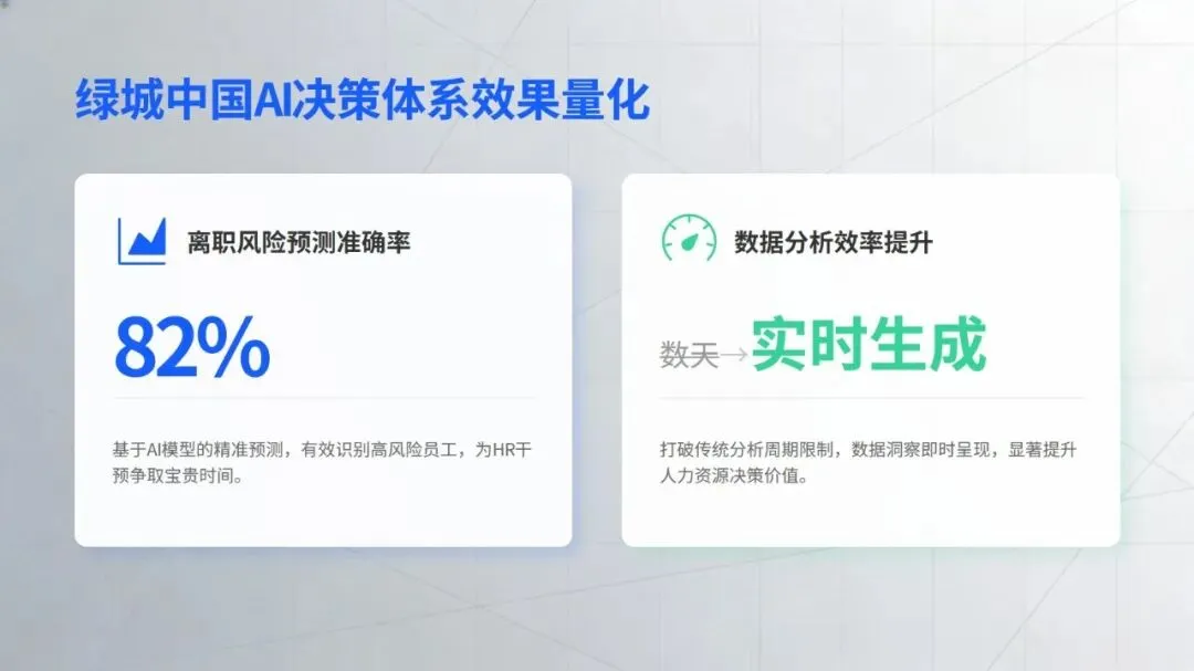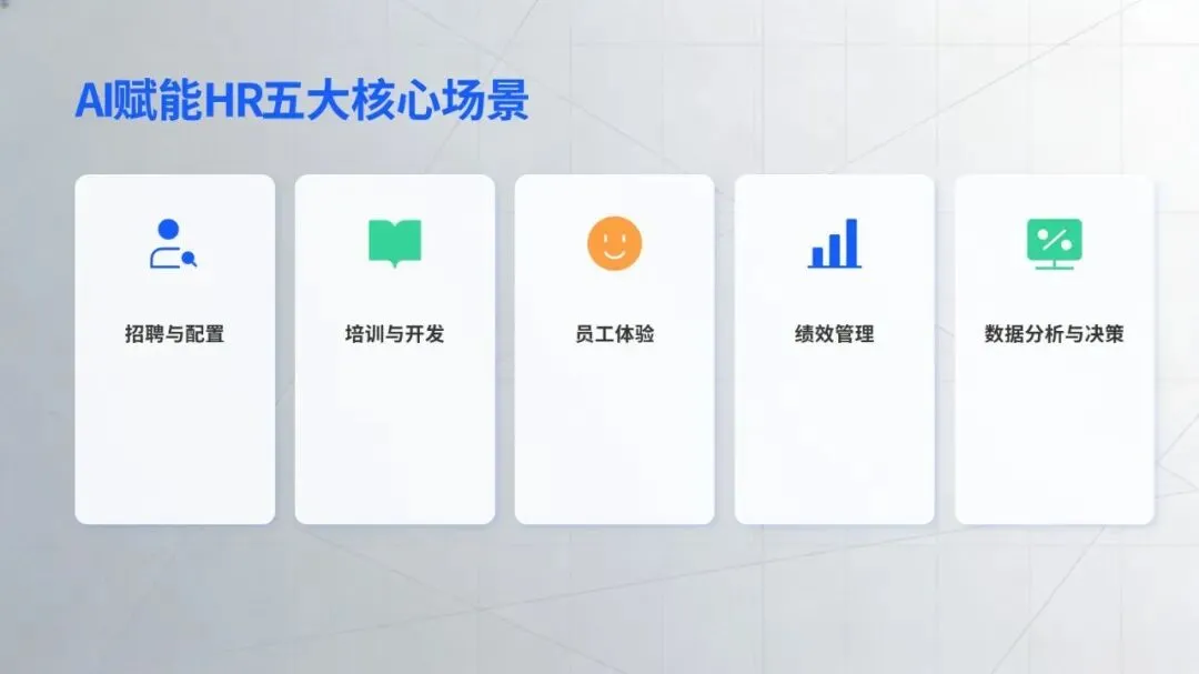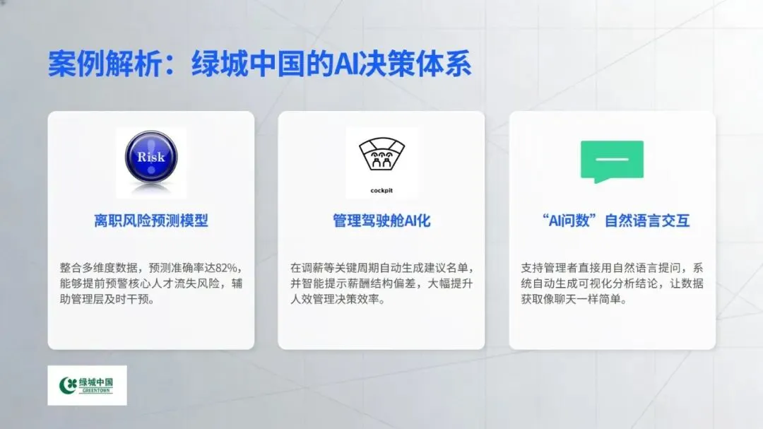 在核心工作场景中,智能技术的价值已充分显现:招聘环节打破传统 “广撒网” 模式,通过精准匹配、智能沟通等方式提升效率,丹纳赫等企业搭建的智能招聘体系成为行业标杆;培训领域借助知识库数字化、个性化内容推荐,为人才成长提速,中国电信的 “AI + 学习” 计划就是典型实践;员工服务方面,政策智能咨询、流程自动化等应用大幅减少重复工作,提升员工体验;绩效与数据分析则让管理告别经验依赖,转向数据支撑的动态优化,绿城中国的离职风险预测等应用为决策提供了有力支持。