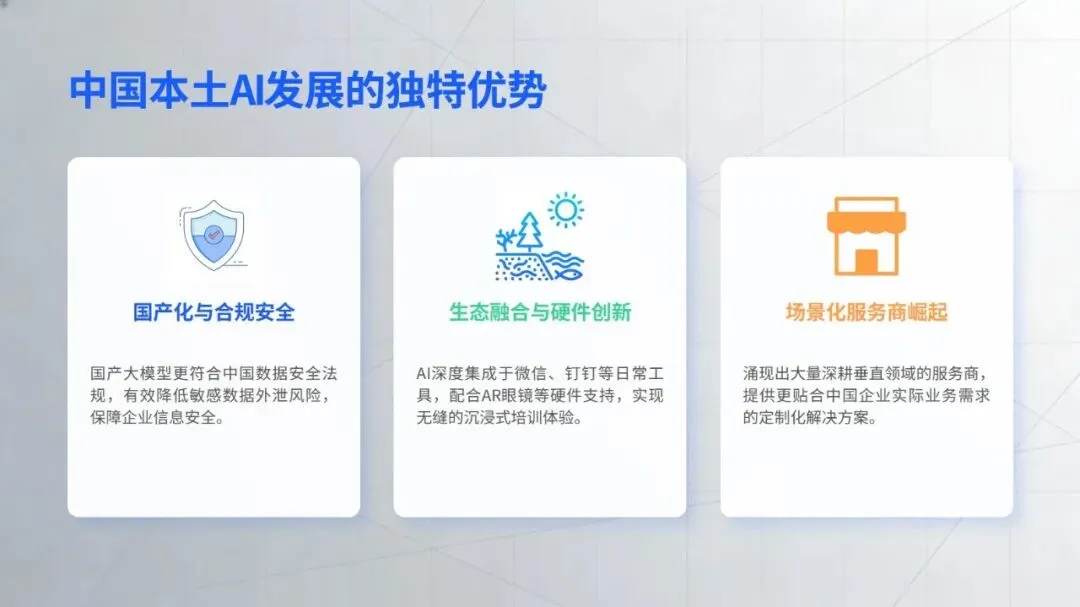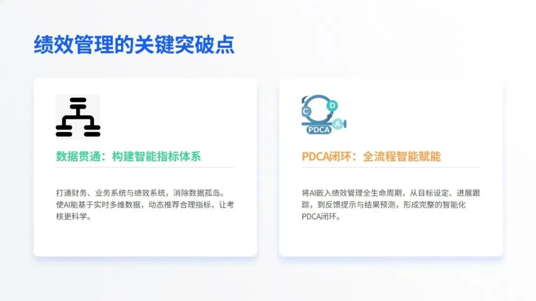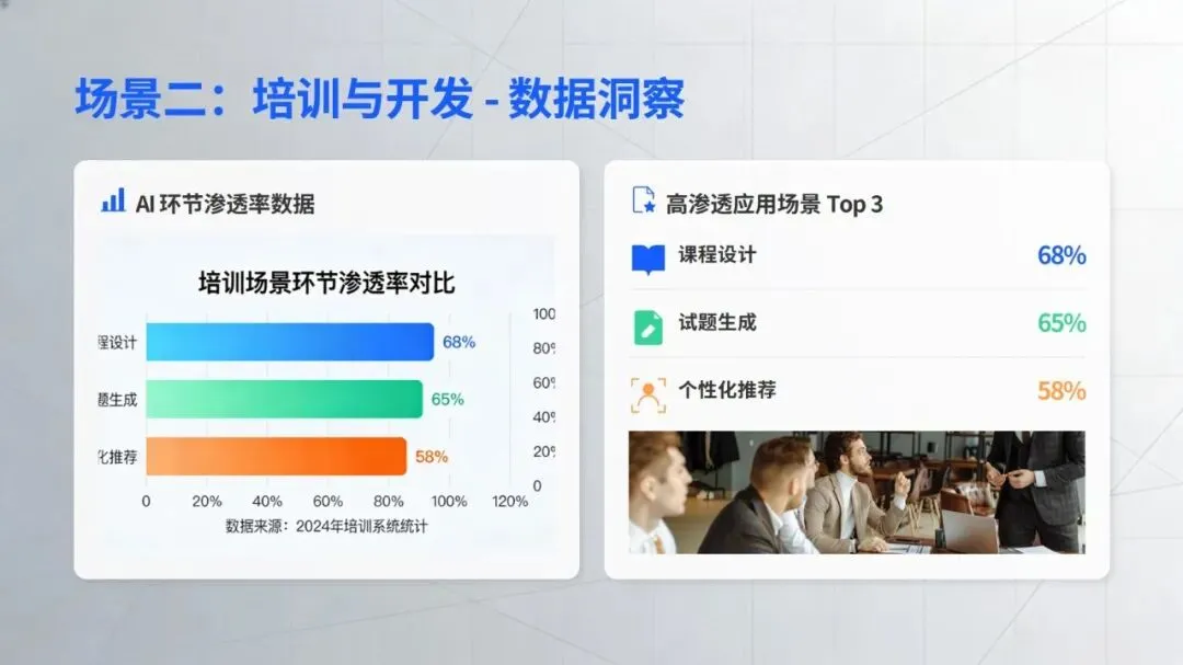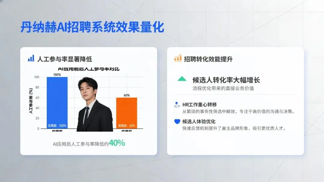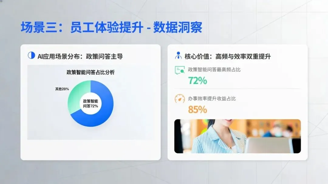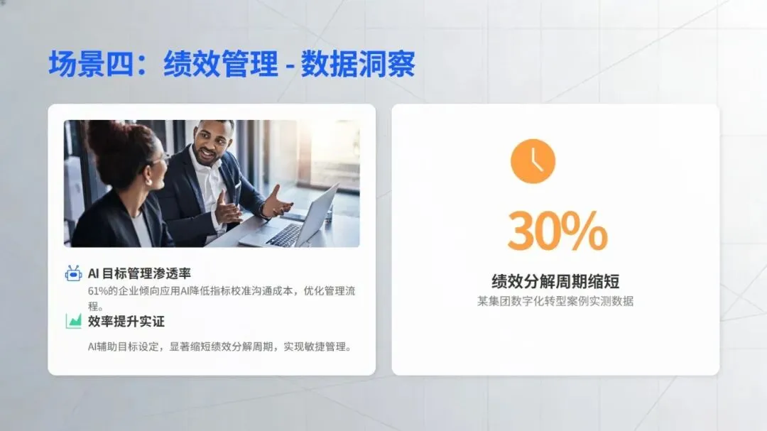在核心工作场景中,智能技术的价值已充分显现:招聘环节打破传统 “广撒网” 模式,通过精准匹配、智能沟通等方式提升效率,丹纳赫等企业搭建的智能招聘体系成为行业标杆;培训领域借助知识库数字化、个性化内容推荐,为人才成长提速,中国电信的 “AI + 学习” 计划就是典型实践;员工服务方面,政策智能咨询、流程自动化等应用大幅减少重复工作,提升员工体验;绩效与数据分析则让管理告别经验依赖,转向数据支撑的动态优化,绿城中国的离职风险预测等应用为决策提供了有力支持。