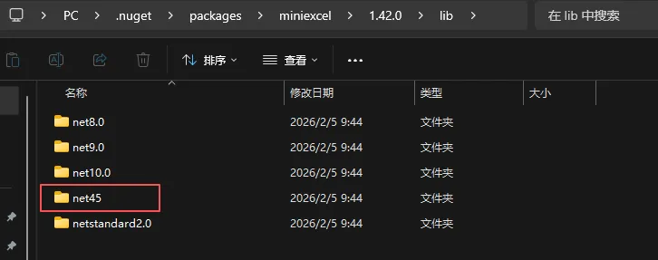 下载 DLL: 在 NuGet 或 GitHub 下载 MiniExcel.dll(建议选择 net45 版本的 DLL)。