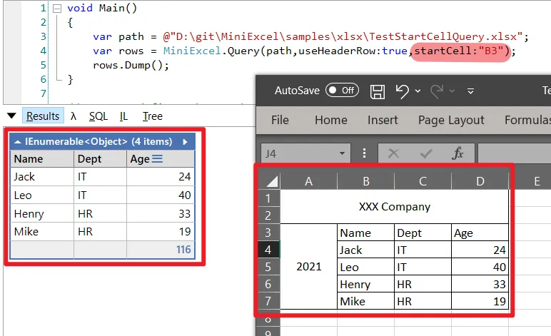 // 告诉 MiniExcel,表头在 A3,数据从这里开始var rows = MiniExcel.Query<User>(path, startCell: "A3").ToList();