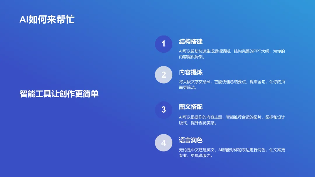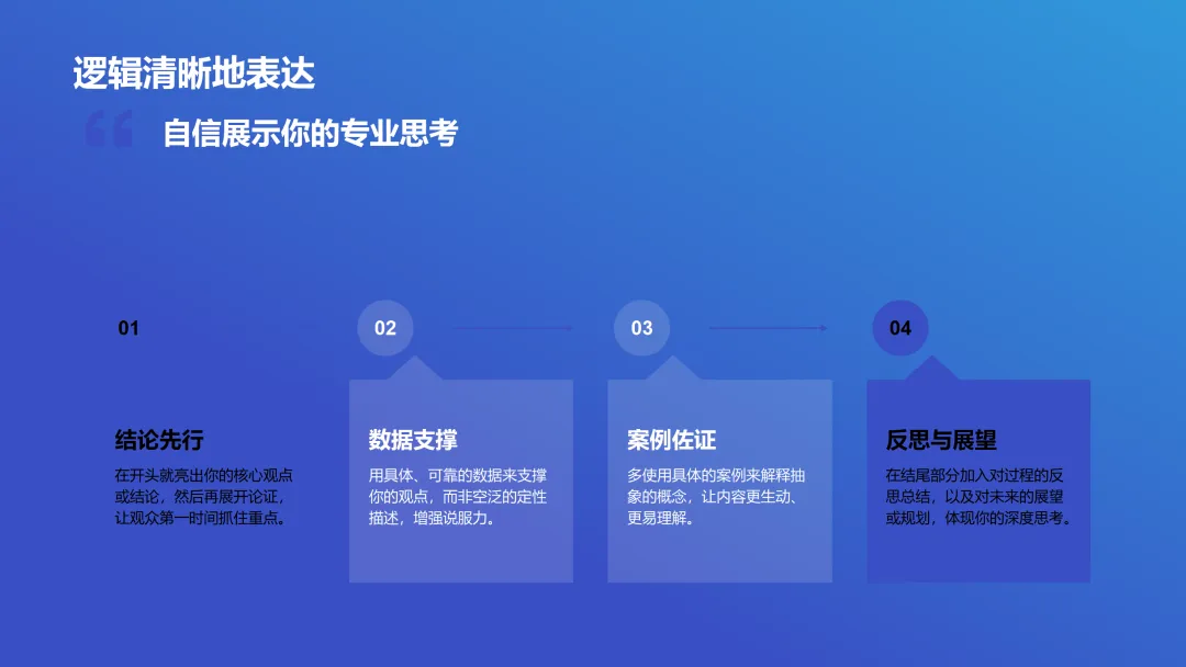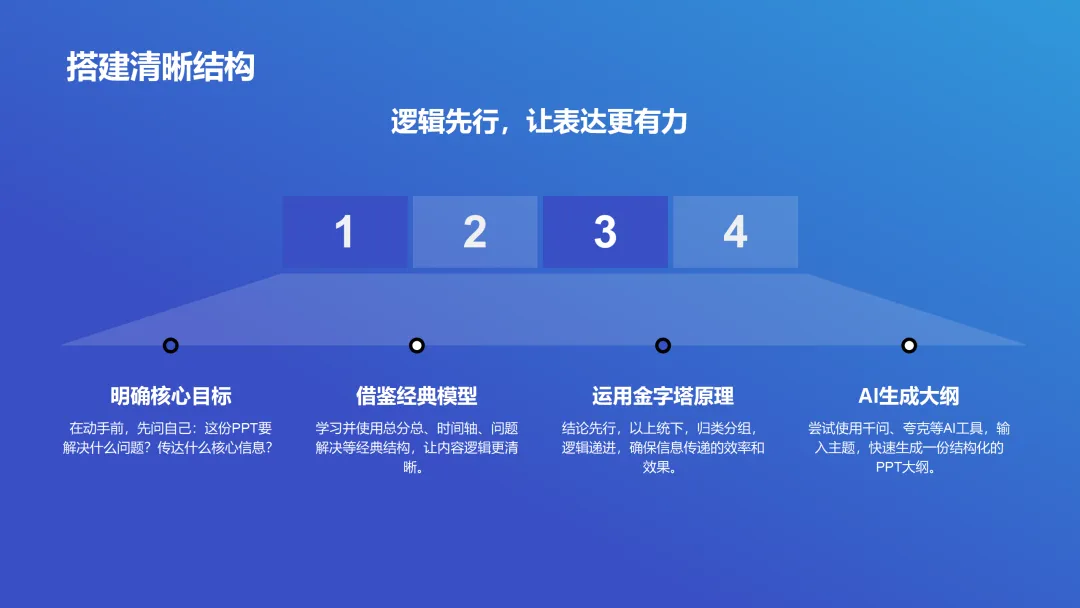你的PPT要传达什么信息、解决什么问题;可借鉴总分总、时间轴等经典结构,或运用金字塔原理(结论先行、以上统下),让内容条理清晰、重点突出;也可借助 AI 生成大纲,再结合自身实训内容调整优化,让逻辑更贴合需求。