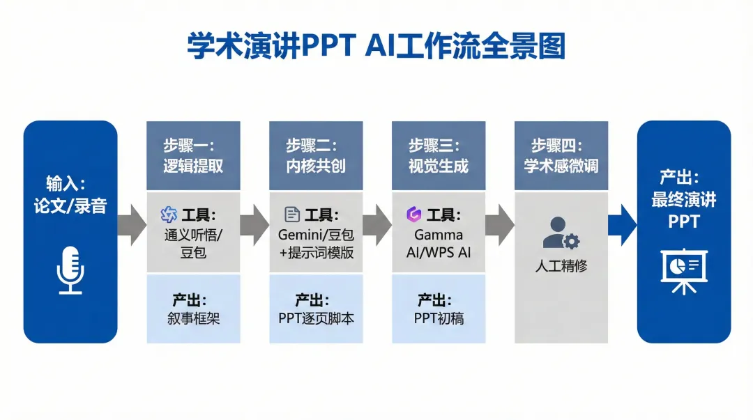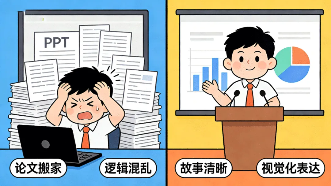 是不是也有过这样的经历?熬夜赶出的论文,在把它变成演讲PPT时,却卡在了第一页。 对着满屏数据和复杂逻辑,不知如何提炼故事线;做出的页面像“论文截图堆砌”,被导师或同行评价“重点不清、逻辑松散”。问题根源在于,我们常把“做PPT”等同于“美化排版”,却忽略了其核心是 “进行一场有说服力的学术叙事” 。今天,我作为和你们一样在学术圈摸爬滚打的UP主,分享一套我压箱底的 “AI辅助学术叙事工作流” 。第一步:颠覆认知——你的PPT,应从“对话”开始