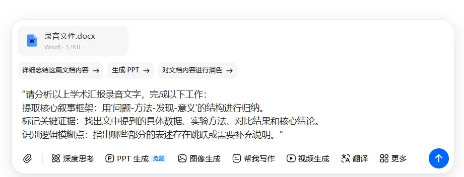 AI转写与初筛:将录音丢给通义听悟或豆包,生成文字稿。接着,下达关键指令:(指令内容略)