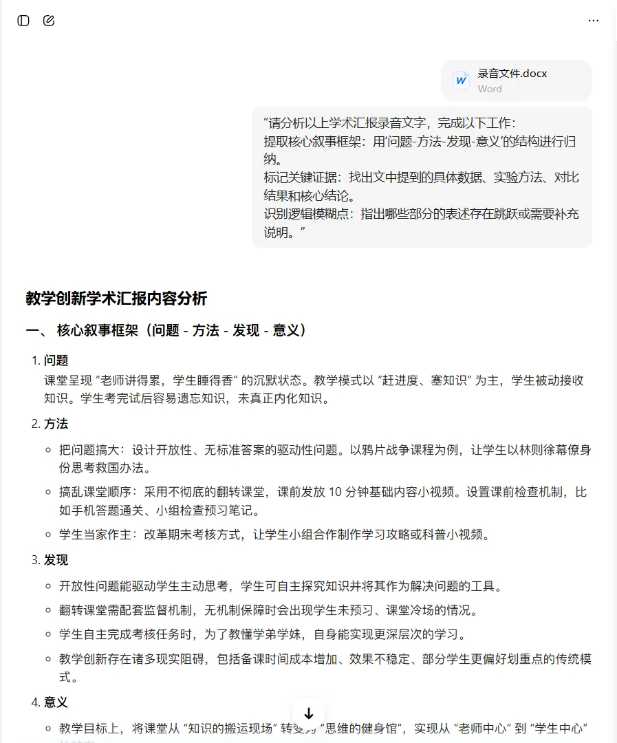 这一步的价值,是让AI充当你的“第一听众”和“逻辑校对员”,帮你从混乱的初稿中,抽取出演讲的骨骼。