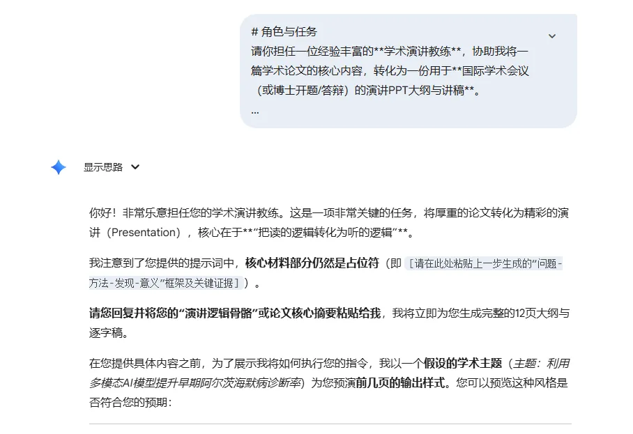 核心工具:豆包 / 文心一言 / Gemini + 结构化提示词拿到“逻辑骨骼”后,我们需要赋予它血肉。这是最关键的一步,你需要一份专为学术演讲设计的提示词,与AI进行深度对话。