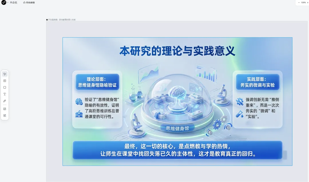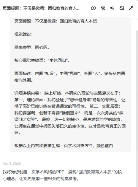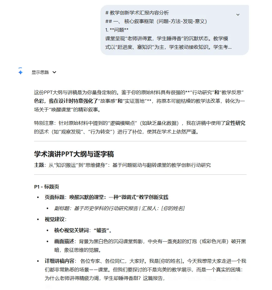 将这份提示词和你的“逻辑骨骼”一起提交给豆包或Gemini。它会生成一份远超你想象的、充满专业细节和叙事技巧的PPT蓝图。反复与AI对话,针对某一页进行深化或修改,直到你满意为止。第三步:高效生成与“学术感”微调