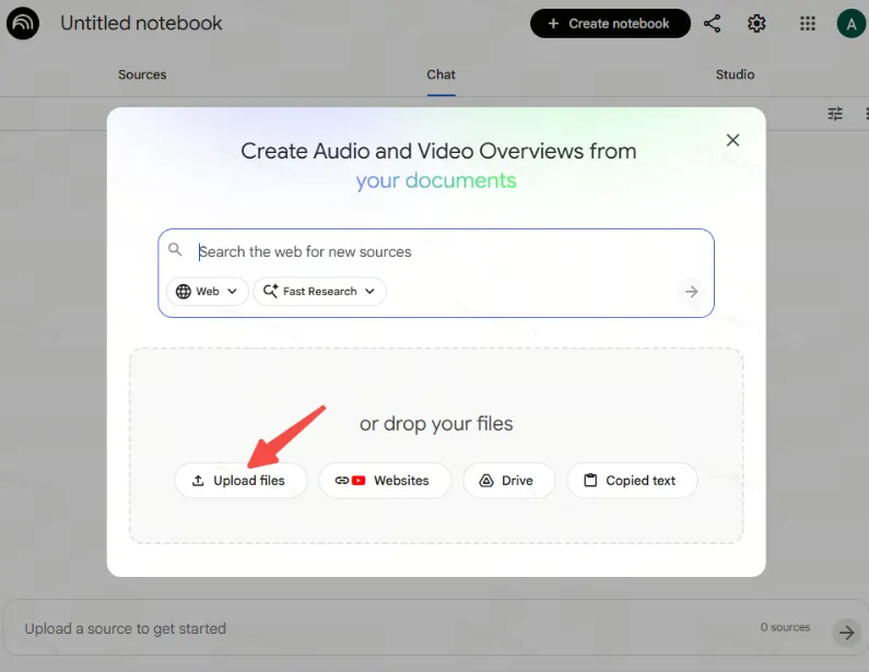 上传资料:将整理好的研究材料拖入NotebookLM.