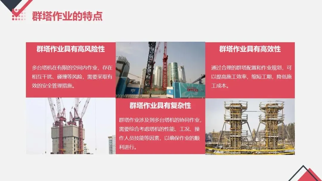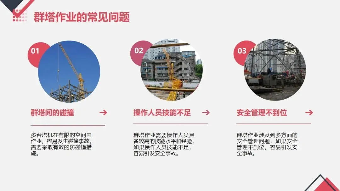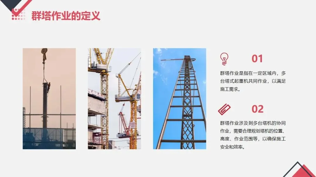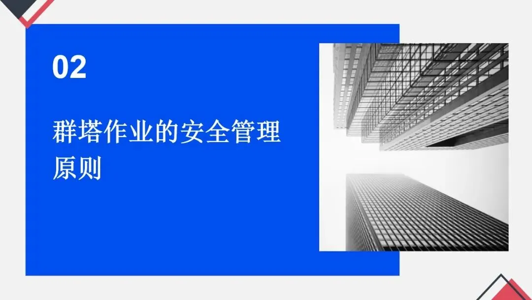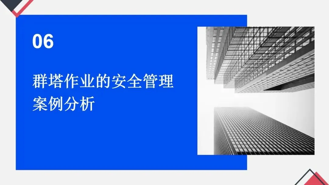 群塔作业是指在一定区域内多台塔式起重机协同作业,以满足施工需求。其具有高风险性、高效性与复杂性,有限空间内多台塔机作业易出现相互干扰、碰撞等问题,操作人员技能不足或安全管理缺位也可能引发安全隐患。安全管理需遵循合理规划布局、优化作业时间、规避相互干扰等原则,同时重视塔机安全性能检测与操作人员培训。安全风险评估需关注塔机间最小安全距离、高度差与作业重叠区域,兼顾风力影响及交叉作业的协调指挥。安全措施涵盖塔机运行控制、防碰撞装置安装使用、安全防护装置维护更新等内容。安全事故发生后需按程序报告调查,依托应急救援预案开展处置,事后总结改进并完善管理制度。多个实际案例表明,完善的安全管理体系、动态监控与强化安全培训,是保障群塔作业安全的关键。