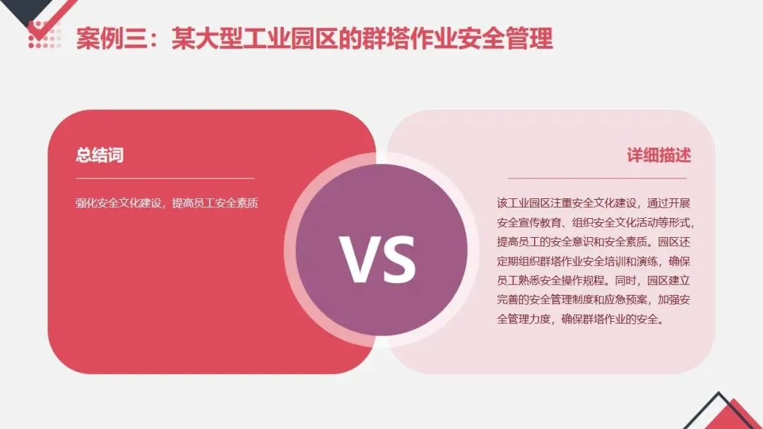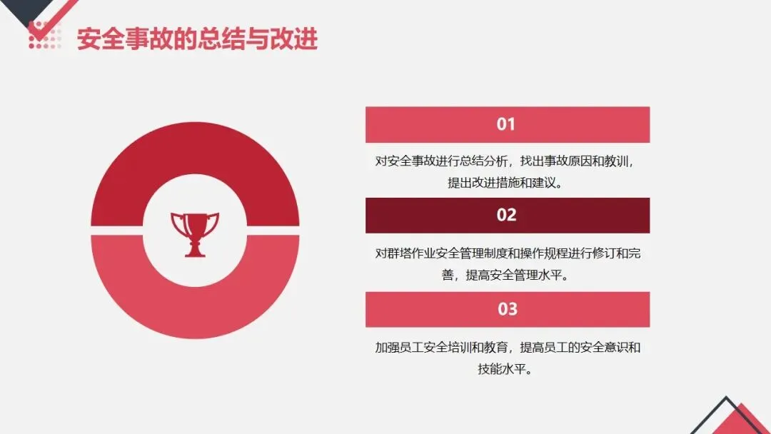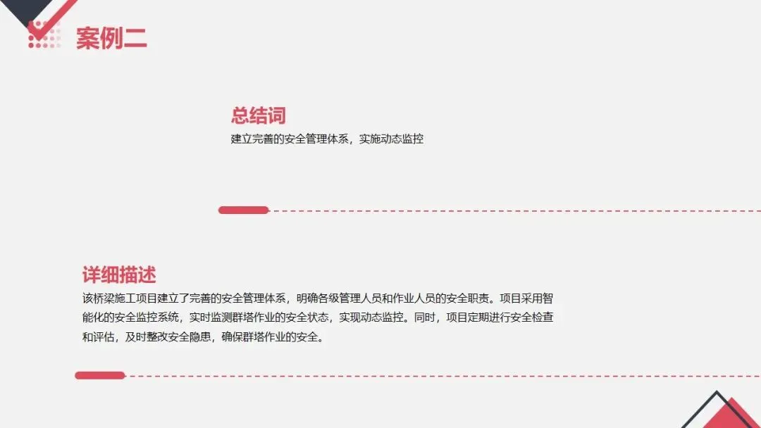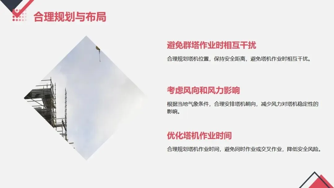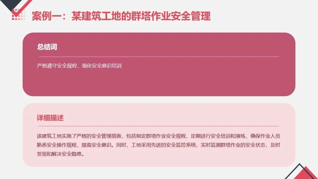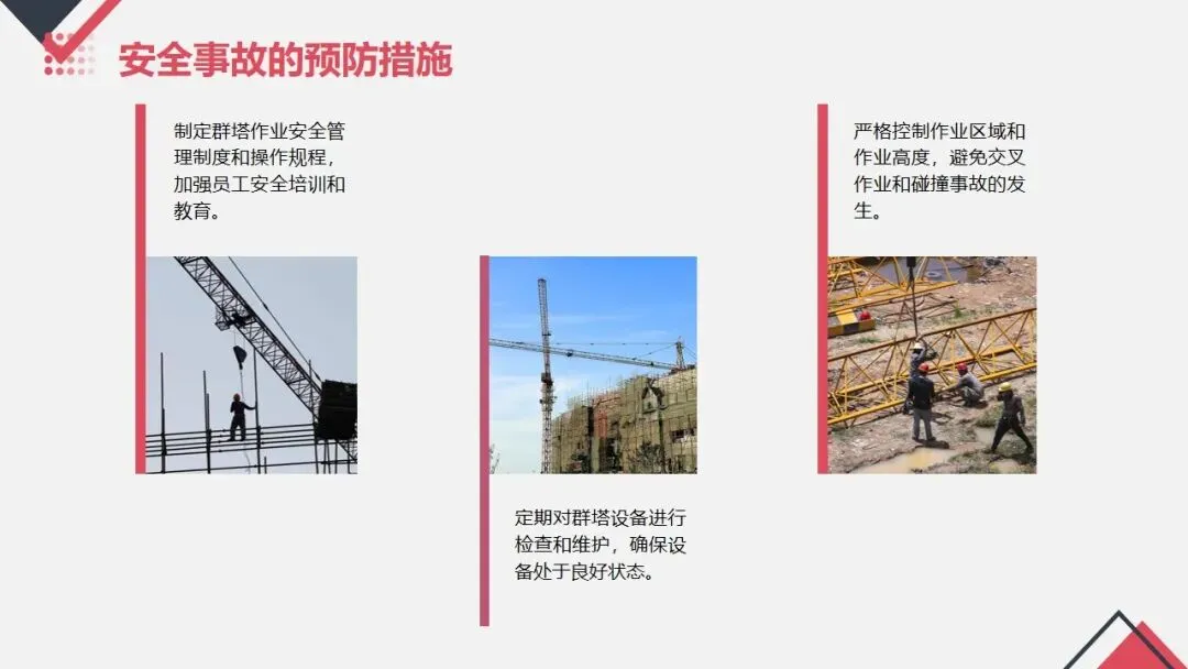 群塔作业是指在一定区域内多台塔式起重机协同作业,以满足施工需求。其具有高风险性、高效性与复杂性,有限空间内多台塔机作业易出现相互干扰、碰撞等问题,操作人员技能不足或安全管理缺位也可能引发安全隐患。安全管理需遵循合理规划布局、优化作业时间、规避相互干扰等原则,同时重视塔机安全性能检测与操作人员培训。安全风险评估需关注塔机间最小安全距离、高度差与作业重叠区域,兼顾风力影响及交叉作业的协调指挥。安全措施涵盖塔机运行控制、防碰撞装置安装使用、安全防护装置维护更新等内容。安全事故发生后需按程序报告调查,依托应急救援预案开展处置,事后总结改进并完善管理制度。多个实际案例表明,完善的安全管理体系、动态监控与强化安全培训,是保障群塔作业安全的关键。