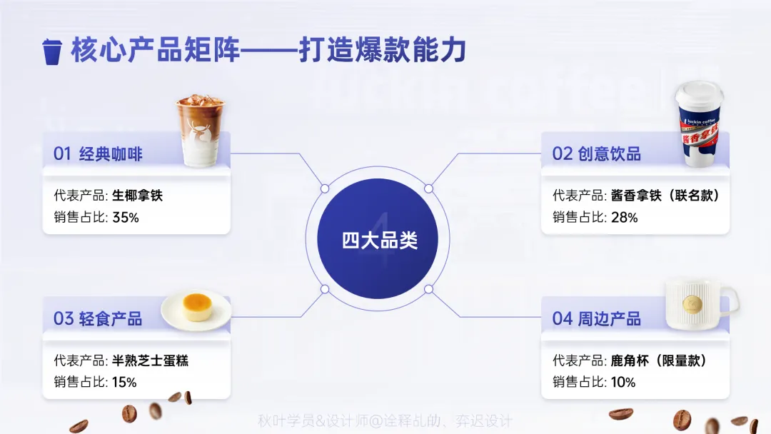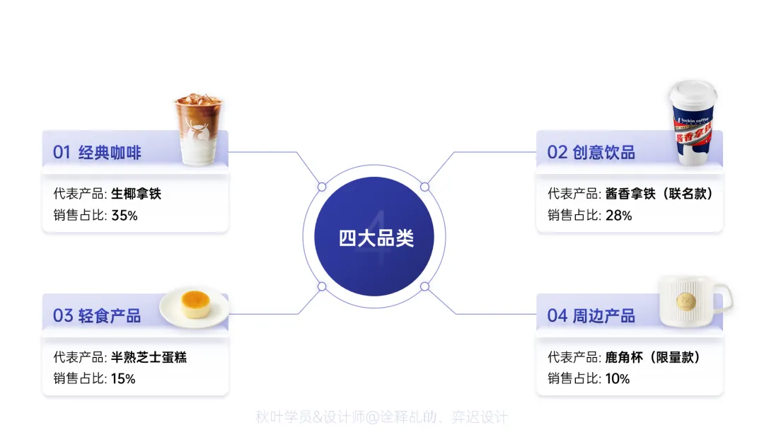 在对角线的四个末端放置辅助信息(如:数据、产品图、装饰色块)。