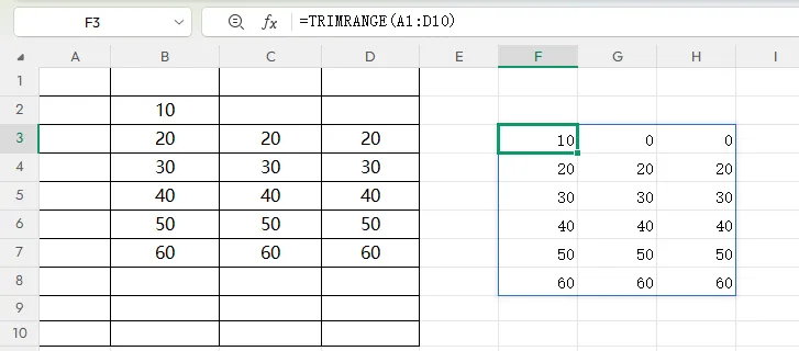 标准公式(新手首选):=TRIMRANGE(A1:D10)