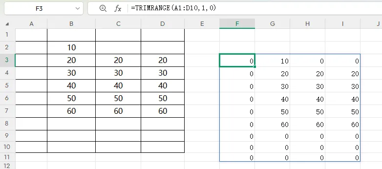 公式:=TRIMRANGE(A1:D10,1,0)