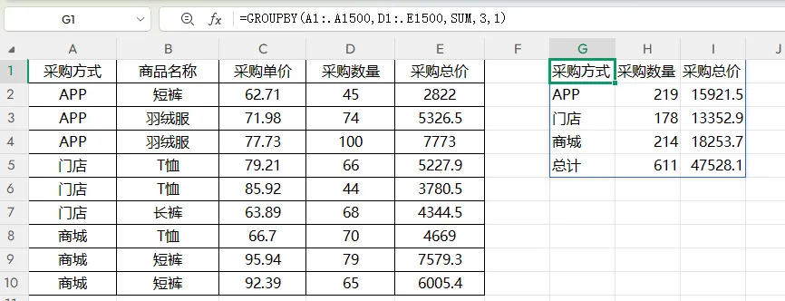 =GROUPBY(A1:.A1500,D1:.E1500,SUM,3,1)