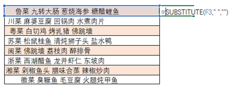 函数SUBSTITUTE,使用效果和“替换”类似,它能用新的字符串替换旧的字符串。如下图:在单元格输入“=SUBSTITUTE(F3," ","")”,按下回车键,就将F3单元格中所有空格删除了。