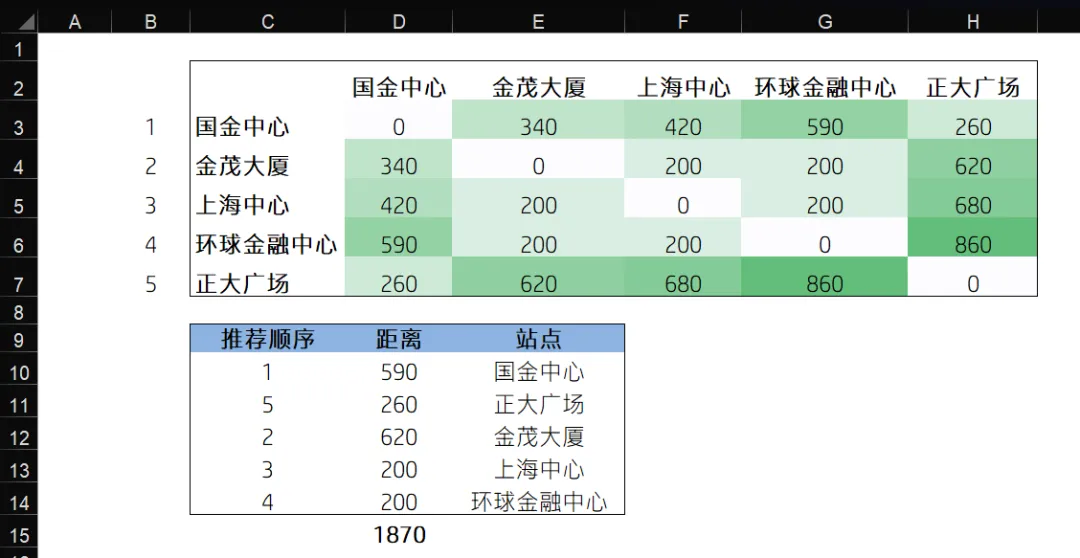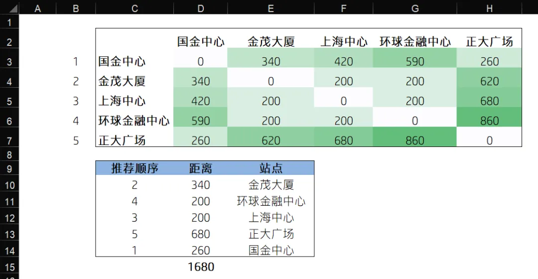 我们在下面的双向表格中列出了5个大楼之间的相互距离(为简化演示,采用的是直线距离),比如最近的距离是上海中心和金茂大厦的200米,最远的距离是正大广场和环球金融中心的860米。将D3:H7区域命名为“距离”,方便后续写公公式。在C10:C14随机输入一个初始顺序,这里我输入的是1,5,2,3,4。意思是第一段旅程是从1号目标国金中心出发到5号目标正大广场;第二段旅程是从5号目标正大广场出发到2号目标金茂大厦。。。以此类推。在E10输入=VLOOKUP(C10,$B$3:$C$7,2,0),根据序号把大楼名称匹配出来,填充到E14。