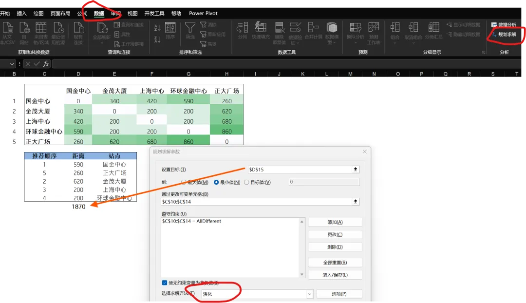 设定好后让规划求解运行,根据电脑配置和模型复杂度,通常可能需要20几秒。最终Excel提示找到如下最优解(可能有多种最优解):如上图,规划求解跑出来的这个方案总距离是1680,相较我们之前随机设置的方案有明显改善。如何理解这一方案:顺序1在第14行,意思是 从1号目标(国金)出发,先到2号目标(金茂),再到4号目标(环球),再到3号目标(上海中心),再到5号目标(正大),最终返回1号目标。最优路径计算同样适用于员工多城市出差的最优成本规划,PCB打孔的最优路径规划等等场景。