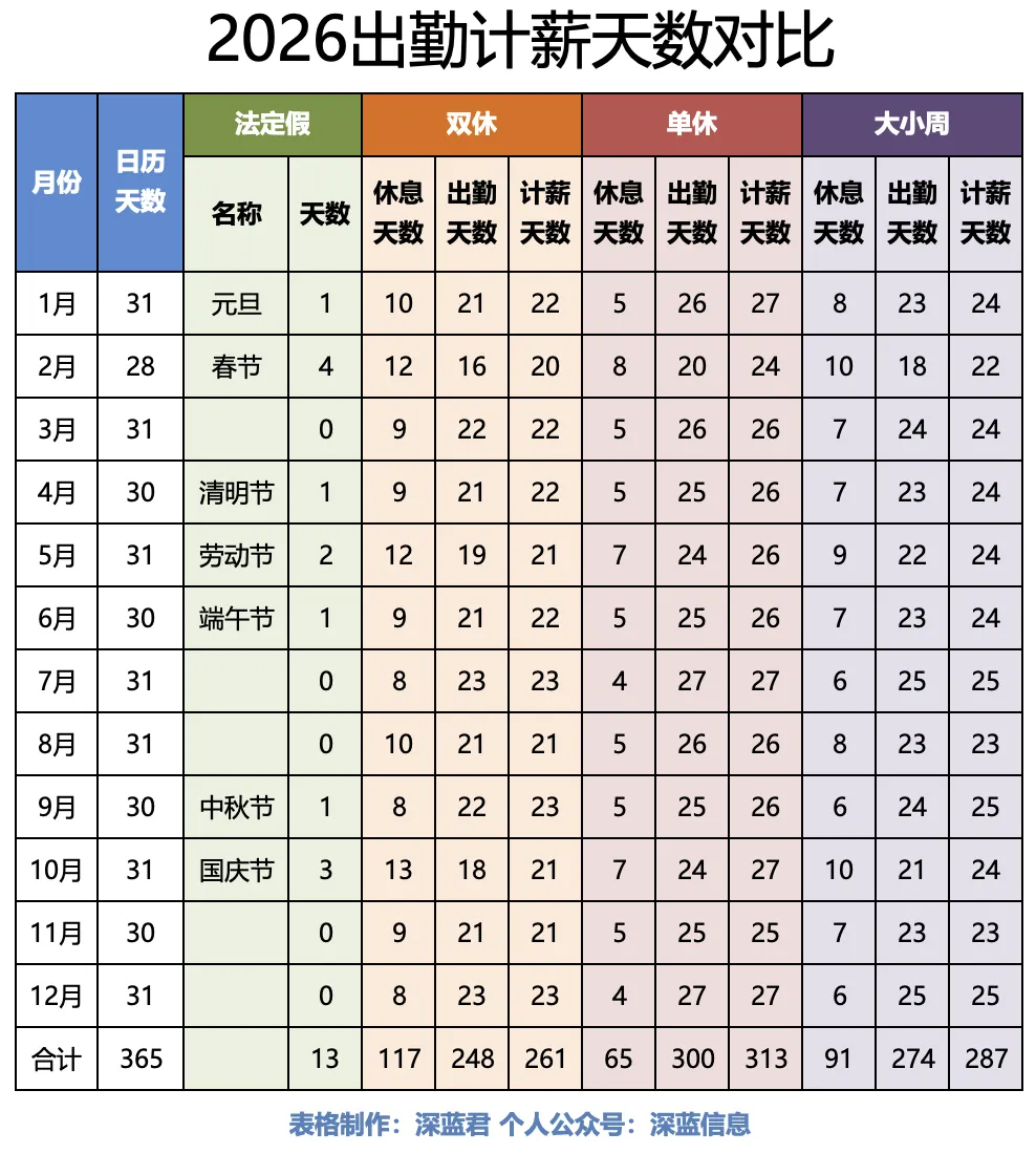 最近在网上看到如下的这个2026出勤计薪天数对比的表格比较实用,所以也帮大家制作了一个Excel版供大家下载。这张表格展示了2026年不同休假制度(双休、单休、大小周)下的应出勤天数与计薪天数对比。