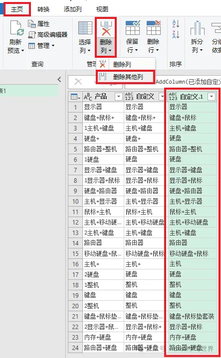 7. 选中最后一列 --> 选择工具栏的“主页”-->“删除列”-->“删除其他列”