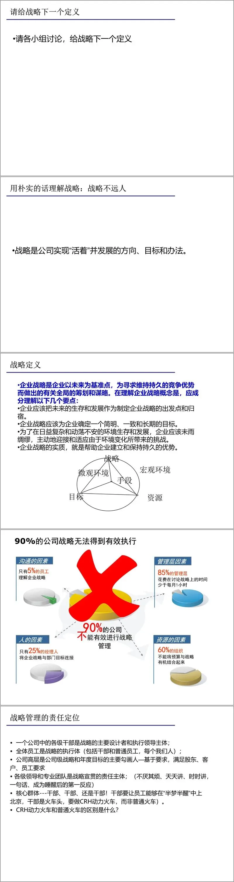 战略的制定与执行是一个需要全员参与的过程。材料强调,战略不是高层管理者的专属事务,而是必须渗透到组织的每个角落。然而现实中,许多企业面临战略与执行脱节的困境——数据显示,高达90%的公司战略未能有效实施,其中关键障碍在于沟通不足、管理层投入时间有限、战略目标与部门目标缺乏衔接,以及资源配置未能与战略协同。这凸显了构建“战略中心型组织”的迫切性,即让战略成为所有业务流程、管理活动和员工行为的核心导向。
