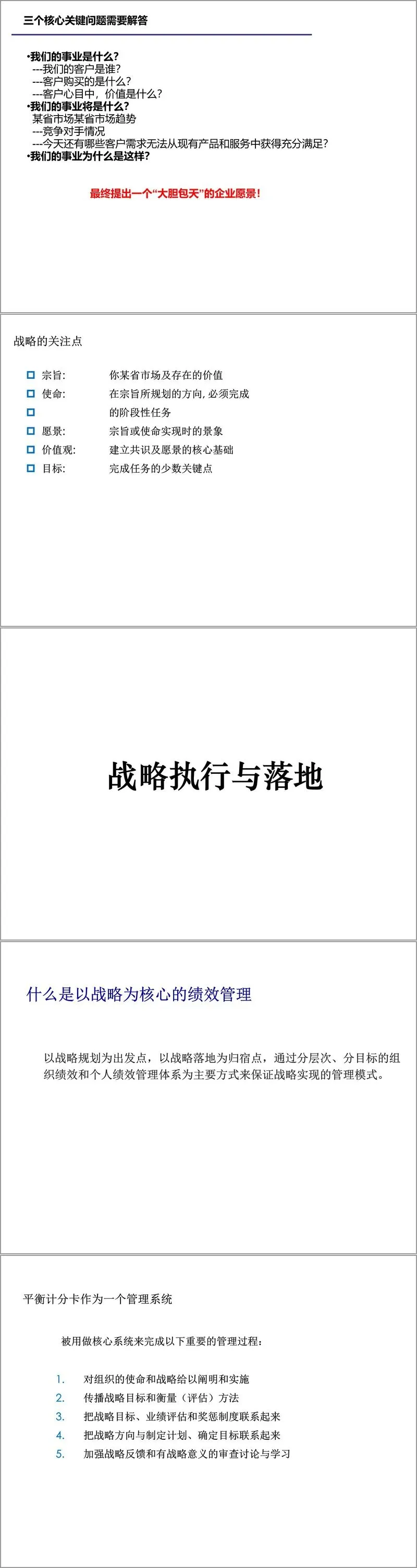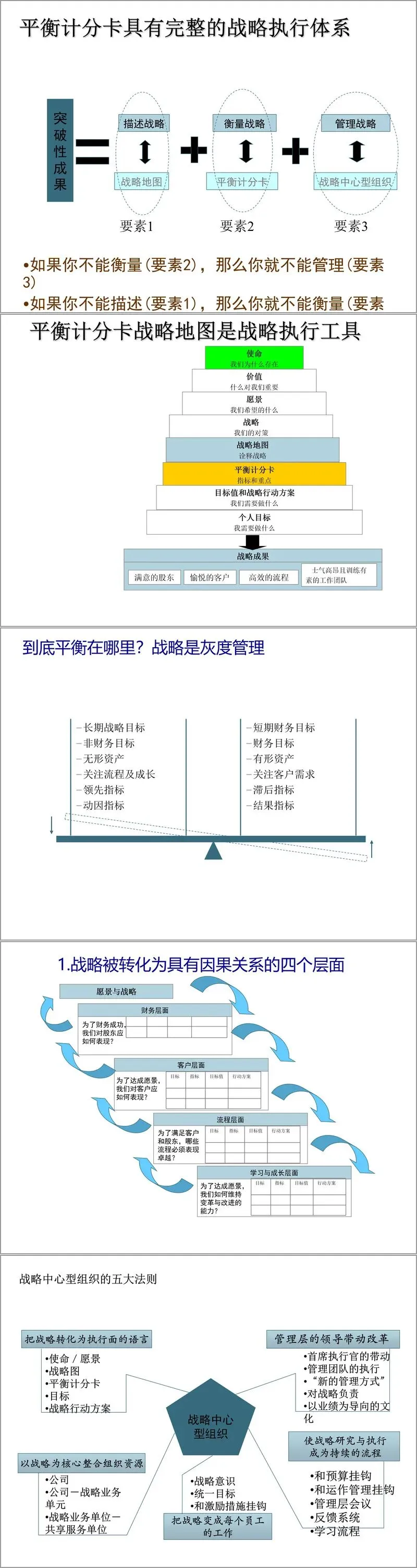 在战略落地方面,材料介绍了平衡计分卡这一重要工具。它通过财务、客户、内部流程、学习与成长四个维度的因果关系,将战略目标转化为可衡量的指标体系,从而实现长期与短期目标、财务与非财务目标、领先指标与滞后指标之间的平衡。战略地图作为战略执行的蓝图,能够清晰描述组织如何创造价值,确保各层级员工对战略有一致理解。