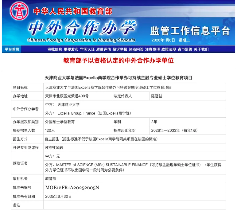 近日,天津商业大学与法国Excelia商学院合作举办的可持续金融专业硕士学位教育项目,经教育部批准正式设立。