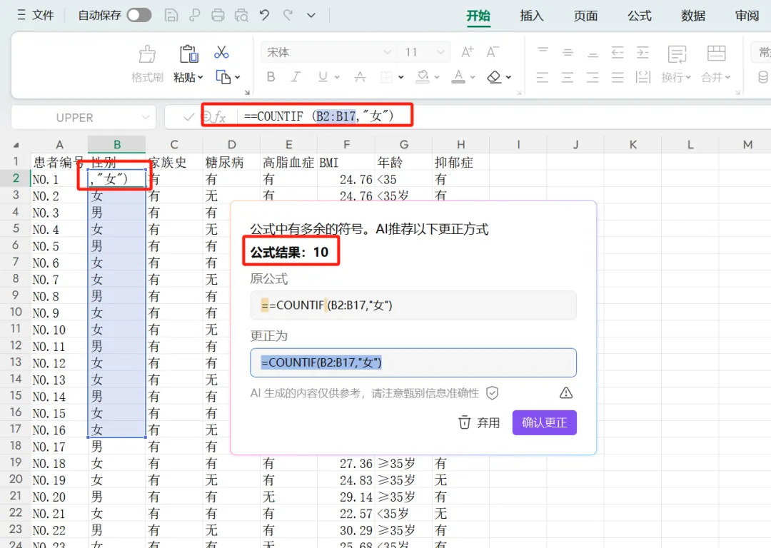 方法一: 首先给出公式=COUNTIF (B2:B17,"女")