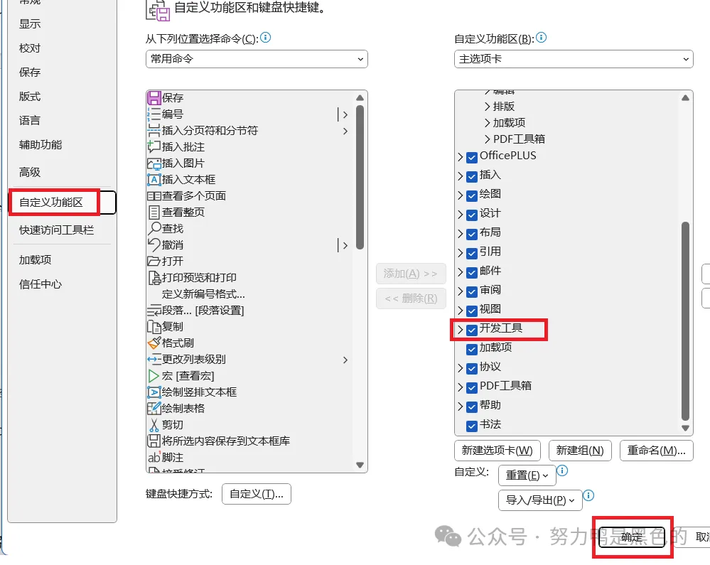 那有的小伙伴就说了,我的Word文档工具栏里没有“开发工具”,也不需要担心,只需要点击【文件】顺次选择【更多...】 【选项】,在打开的选项界面,选中【自定义功能区】,找到【开发工具】,打勾后选择确定即可2.2 代码实现