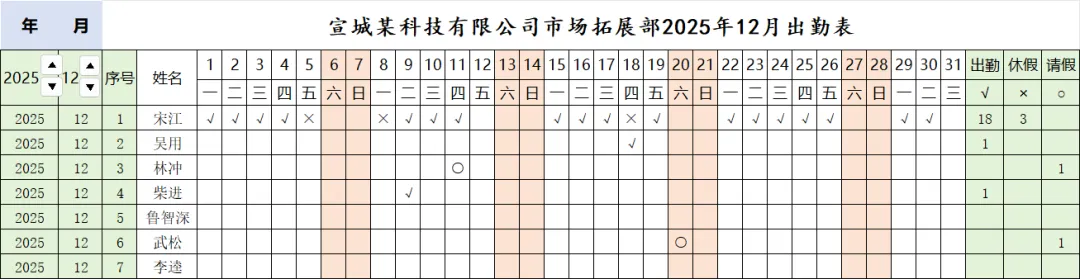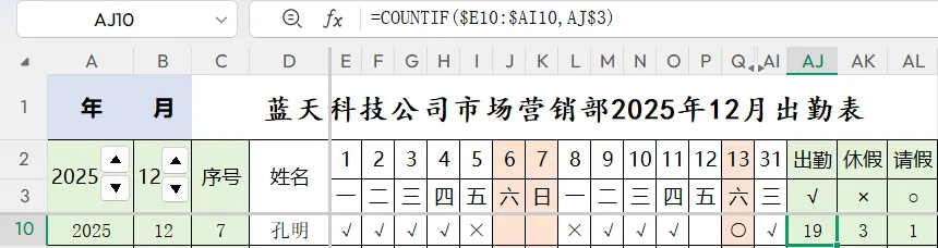 该示例运用了多个函数,如DATE、WEEKDAY、COUNTA、COUNTIF等,另外,多处使用了条件格式功能,主要功能:用上下键选择年月;标题自动更新;月出勤统计自动完成;姓名为空时年月自动隐藏;周末自动分色;统计为零值时自动隐藏;不足31天时日期自动隐藏。