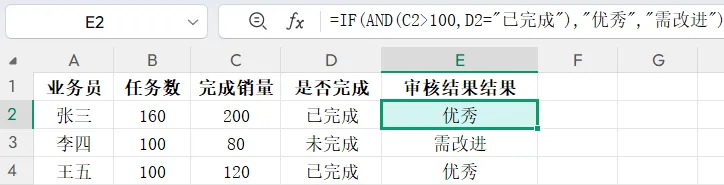 AI生成的公式通常为:=IF(AND(C2>100,D2="已完成"),"优秀","需改进")