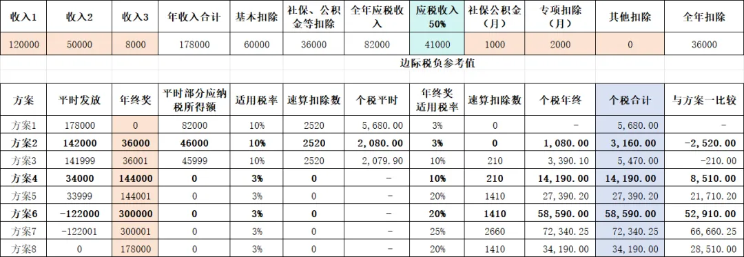 该示例运用了多个函数及函数组合,如SUM、VLOOKUP、IF等,可根据不同收入金额计算多个方案下的个税金额,给出最优筹划建议。