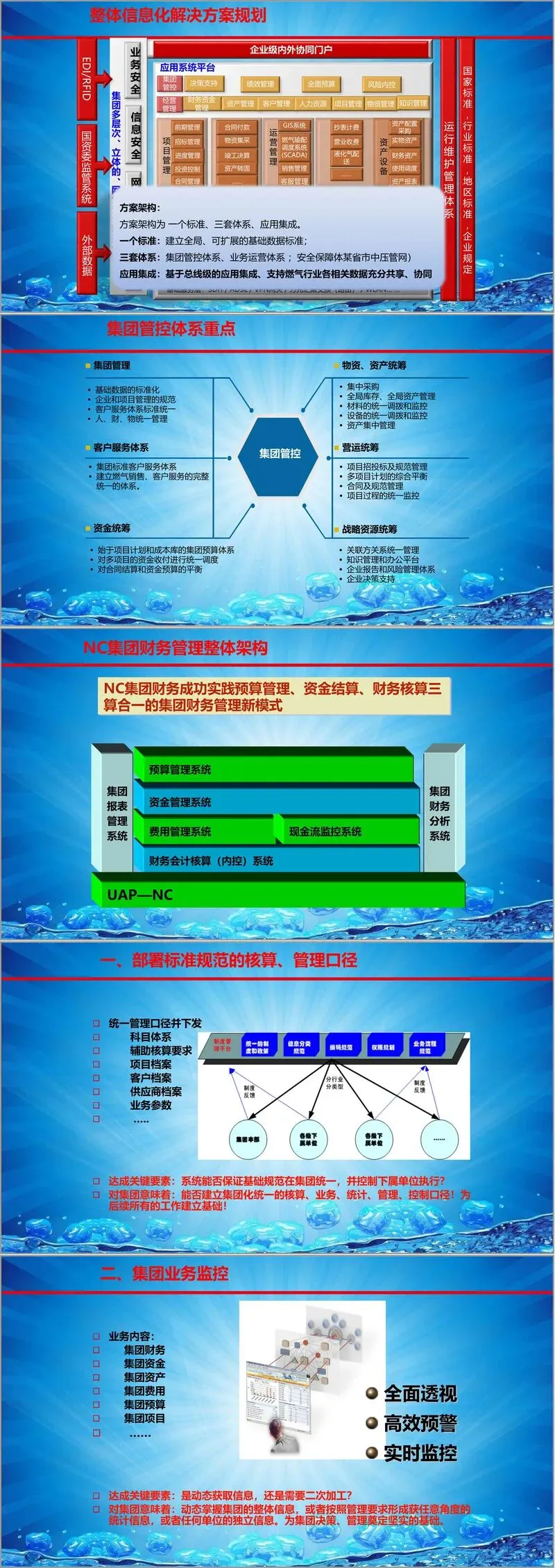 集团管控是本次信息化建设的重中之重。方案强调,要实现有效的管控,首先必须实现基础数据的标准化、企业和项目管理的规范化、客户服务体系的统一化。在此基础上,方案重点规划了以下几大管控领域: