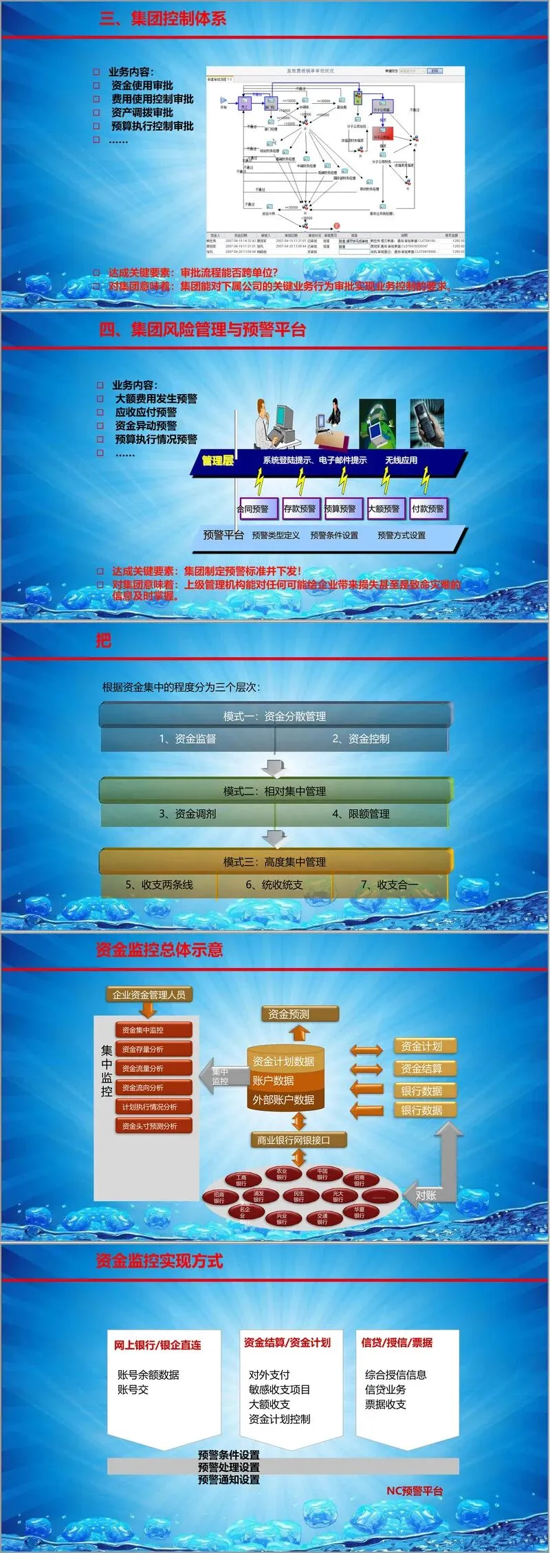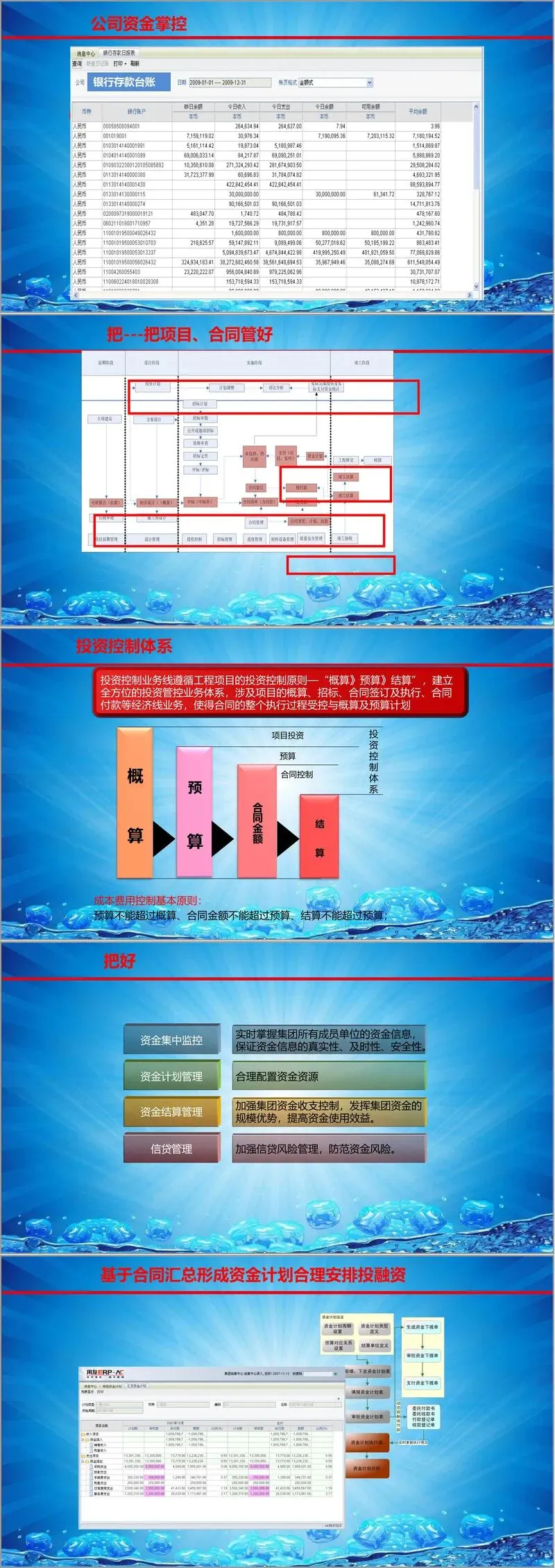 财务集中管控:构建预算管理、资金结算、财务核算“三算合一”的集团财务管理新模式。通过统一科目体系、客户档案、供应商档案等管理口径,确保集团数据的一致性。进而实现对集团资金、资产、费用、预算、项目的实时监控、动态预警和跨单位审批控制,使集团领导能够全面透视经营状况,及时识别和管理风险。资金管理可根据企业实际情况,从分散监控逐步过渡到高度集中的“收支两条线”或“统收统支”模式。