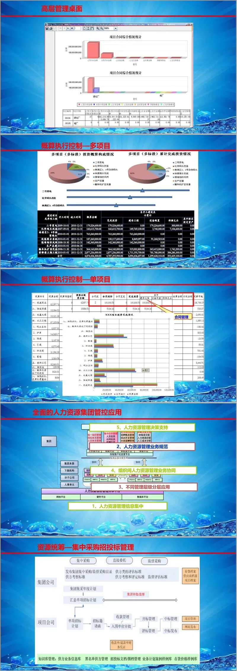 项目与投资控制:针对燃气集团大量的管网、场站等工程项目,方案提出了严格的投资控制体系,核心原则是“概算不超过预算、合同金额不超过预算、结算不超过合同”。通过信息化手段,对项目从立项、设计、招标、合同签订、施工、付款到竣工决算的全过程进行精细化管理和控制,实时对比概算、预算、合同、结算与实际成本,确保投资可控。系统能够提供多项目概算执行情况总览和单一项目的详细投资分析,为管理层决策提供精准数据支持。