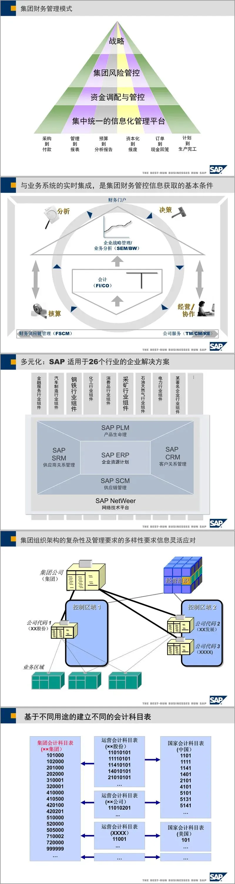 为应对这些挑战,构建集中统一的信息化管理平台成为必然选择。该平台需满足五大关键需求:一是提供集成的技术平台,统一数据标准与管理体系;二是具备灵活的组织架构定义能力,以适应集团的动态发展;三是实现规范与流程的统一,提升效率,压缩成本;四是支持多元化、跨地域的业务特性;五是确保信息的快速、透明、准确,并建立灵活的报告体系。SAP解决方案正是基于此类需求构建,其核心在于实现财务与业务系统的实时集成,确保物流、信息流、资金流的统一。