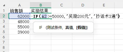 假设A列是员工销售额,要在B列自动生成奖惩结果:销售额≥50000元,显示"奖200元";低于50000元,显示"抄话术3遍"